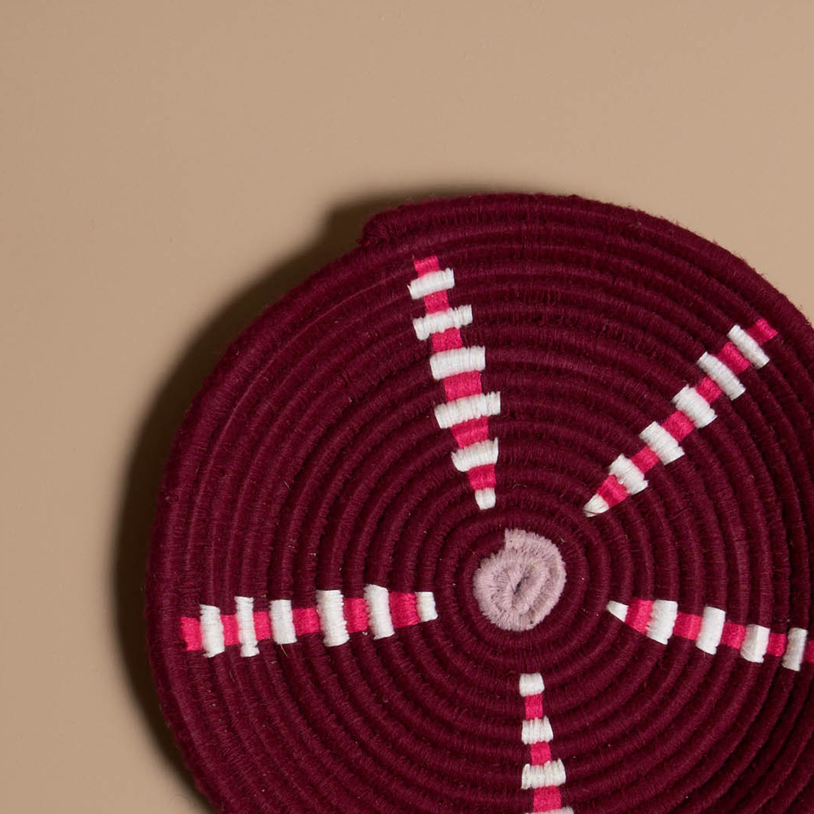 This handcrafted Moroccan plate is made from wicker and colored wool, showcasing different shades of pink and bordeaux with white accents. The traditional geometric patterns create a sophisticated and harmonious design, ideal for enriching any environment with a touch of color and originality. Perfect for decorating walls, tables, or shelves, this plate adds personality to spaces, creating a warm and elegant atmosphere. The combination of warm and bright tones makes it versatile and suitable for various interior styles. A unique piece that enhances interiors with authenticity and timeless beauty.