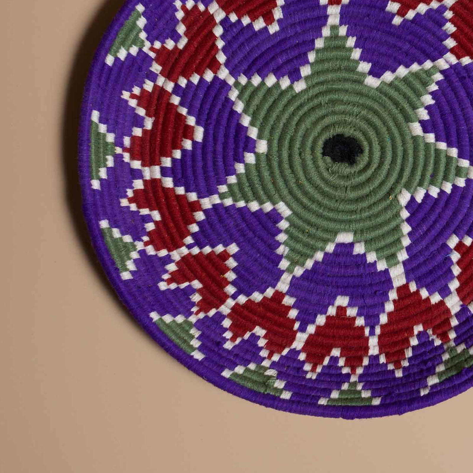 This Moroccan plate, handmade with wicker and colored wool in elegant tones of purple, red, and sage green, showcases traditional geometric patterns that are intricately woven, giving it a unique and refined look. Perfect for enhancing interior spaces, it adds a touch of color and originality. Ideal for decorating walls, tables, or surfaces, it creates a warm and inviting atmosphere, enriching any room with style. A decorative piece that adds personality to living rooms, bedrooms, or hallways, elevating every space with elegance and a creative touch typical of Moroccan craftsmanship.