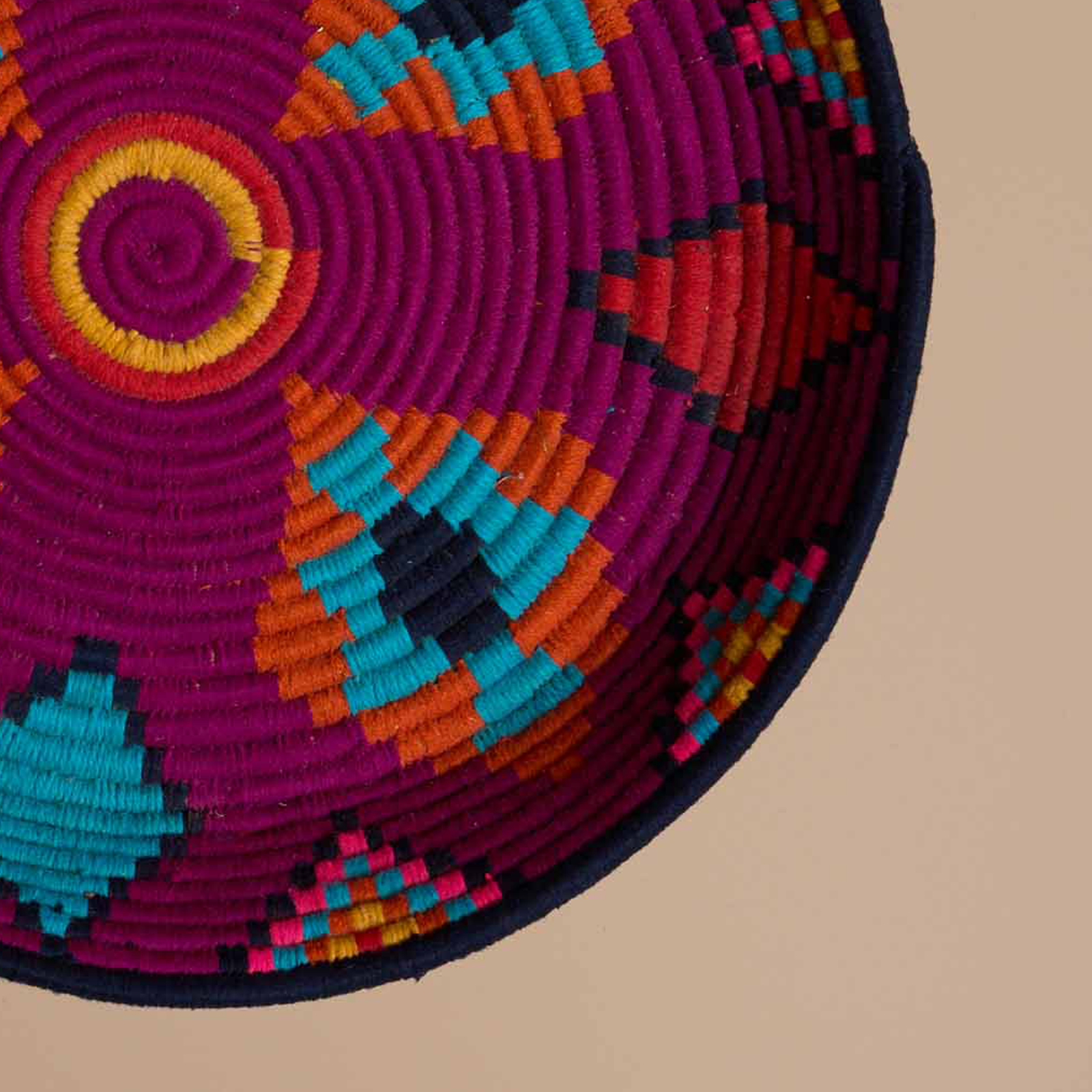 VAT incl.This Moroccan plate, crafted from wicker and colorful wool, features a geometric design in shades of pink, red, light blue, and yellow. This unique piece adds vibrancy and color to any space. Perfect for decorating walls, tables, or shelves, it brings a touch of originality, elegance, and cheerfulness to every environment.
