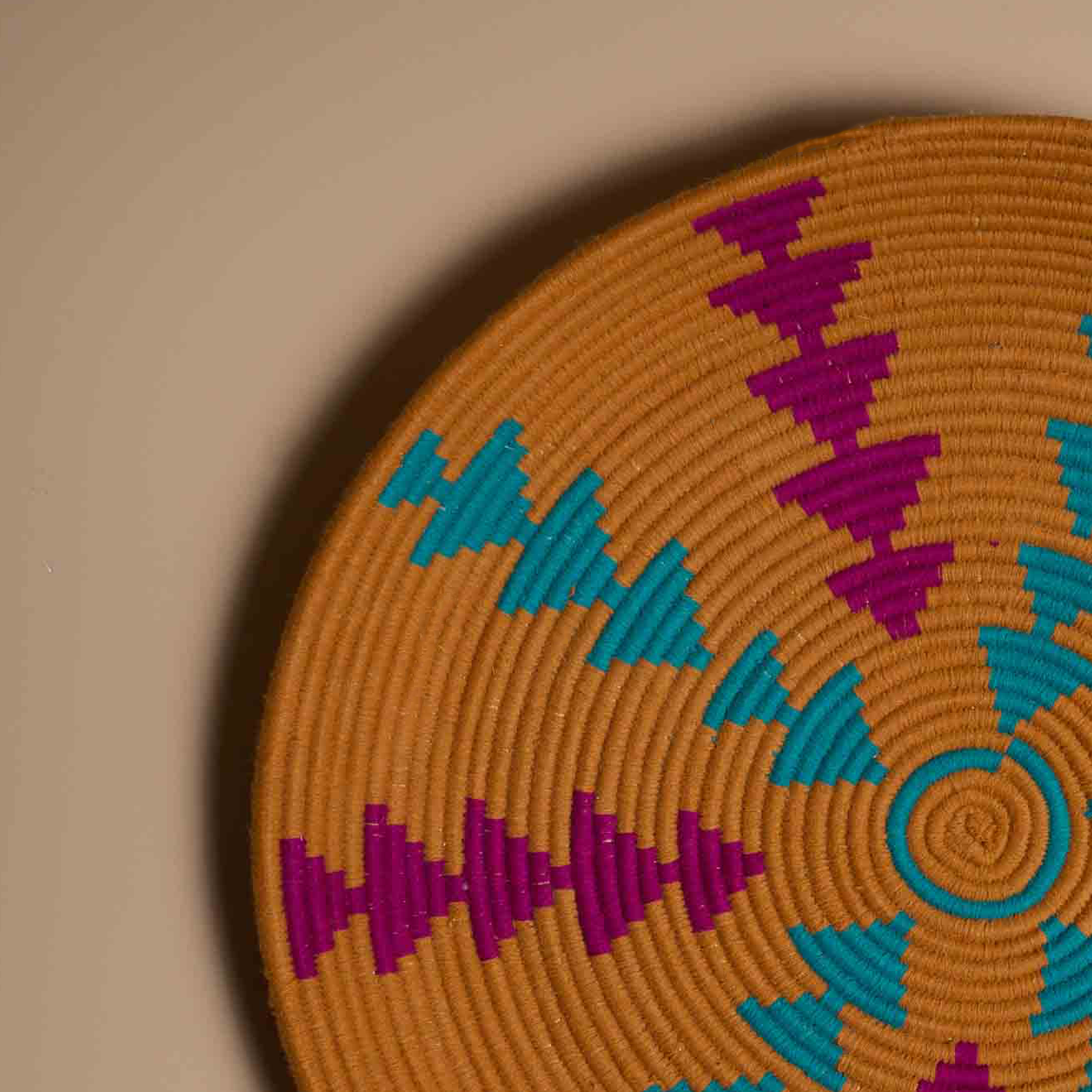 This Moroccan plate, crafted from wicker and colored wool, features a geometric design with alternating fuchsia and light blue triangles, creating arrow shapes on a walnut background. The bold and contemporary design adds originality and dynamism to any space. A unique piece, a result of the craftsmanship of Moroccan artisans, who blend tradition and innovation in every detail. Ideal for decorating walls, tables, or shelves, it adds a touch of color and personality to the environment. The combination of vibrant tones and the dark background makes it perfect for modern interiors with elegant and versatile design.