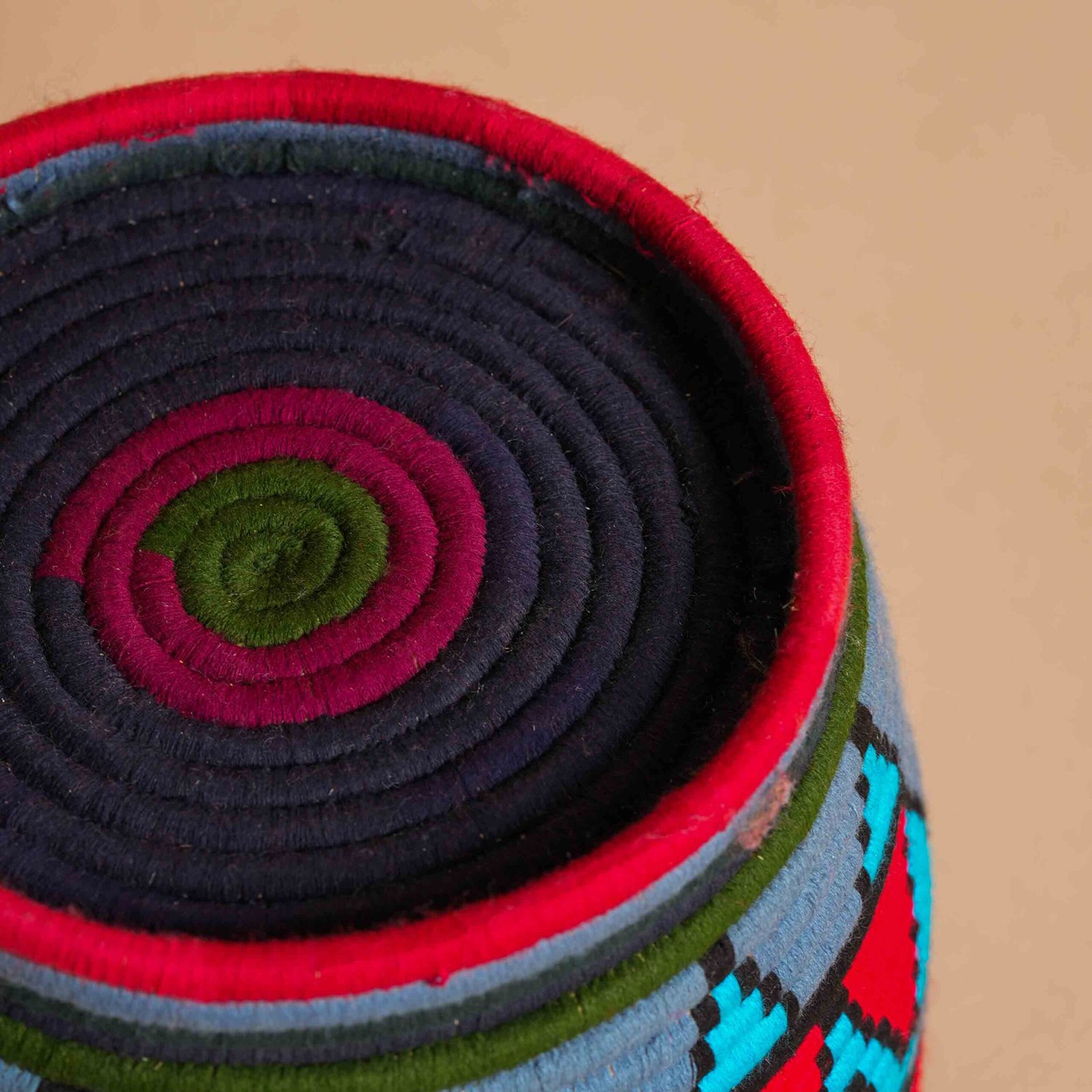 This handcrafted Berber vase, made from natural palm fibers, showcases an enchanting combination of various shades of light blue, red, and pink, creating a harmonious and lively contrast. The geometric design, decorated with wool threads, reflects traditional Moroccan craftsmanship with distinctive and unusual patterns that enrich its aesthetic. Perfect for those wishing to add color and style to any space, it can be used as both a decorative element and a functional container. It brings a touch of Moroccan culture to every area, lending personality and originality to any room with its unique and vibrant elegance.
