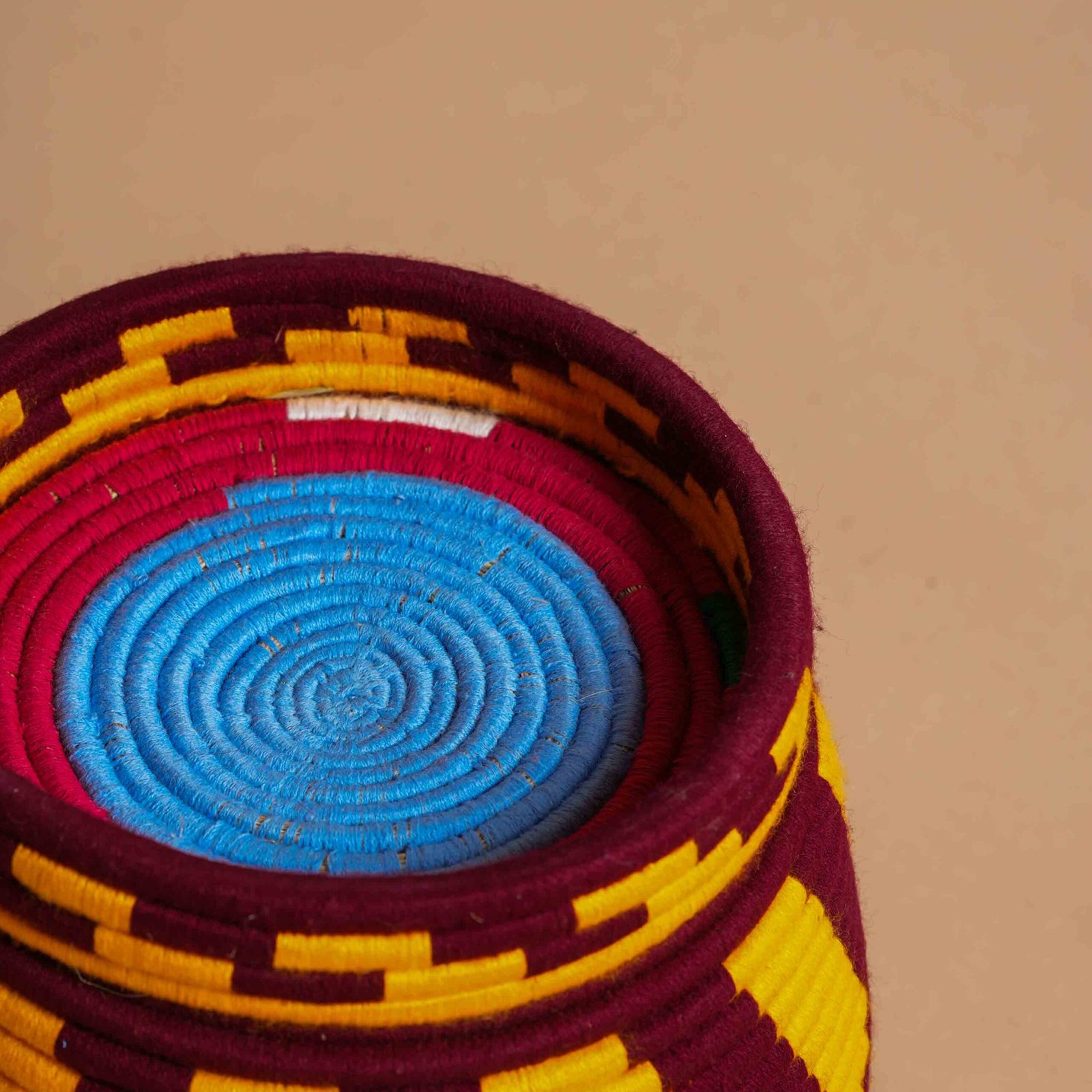 This handwoven Berber vase, crafted from natural palm fibers, showcases vivid hues of burgundy and mustard, creating a vibrant and sophisticated contrast. The geometric design, enriched with wool threads, echoes Moroccan tradition with distinctive zigzag patterns and horizontal bands. Perfect for adding a touch of color and personality to any space, this vase unites functionality and beauty. It can be used as a container for everyday items or as a decorative element, bringing a piece of unique Moroccan craftsmanship into every setting and enriching the decor with elegance and originality.