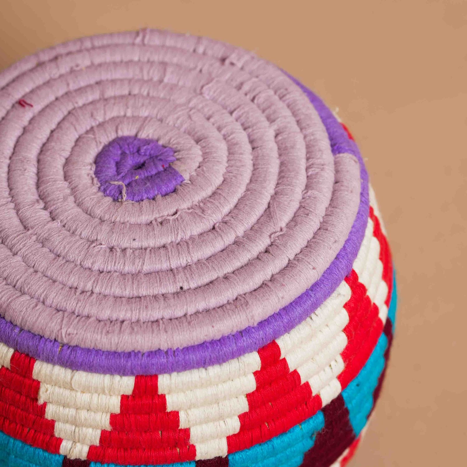 This handwoven Berber vase, crafted from natural palm fibers, features predominant tones of pink, red, burgundy, and light blue, creating a dynamic and captivating contrast. The geometric design, enriched with wool threads, reflects Moroccan tradition with triangle patterns and horizontal bands. Perfect for adding a touch of color and style to any space, this vase unites functionality and beauty. It can be used as both a decorative element and a container for everyday items, bringing a unique and distinctive piece of Moroccan craftsmanship into every setting, and enriching the decor with elegance and vibrancy.
