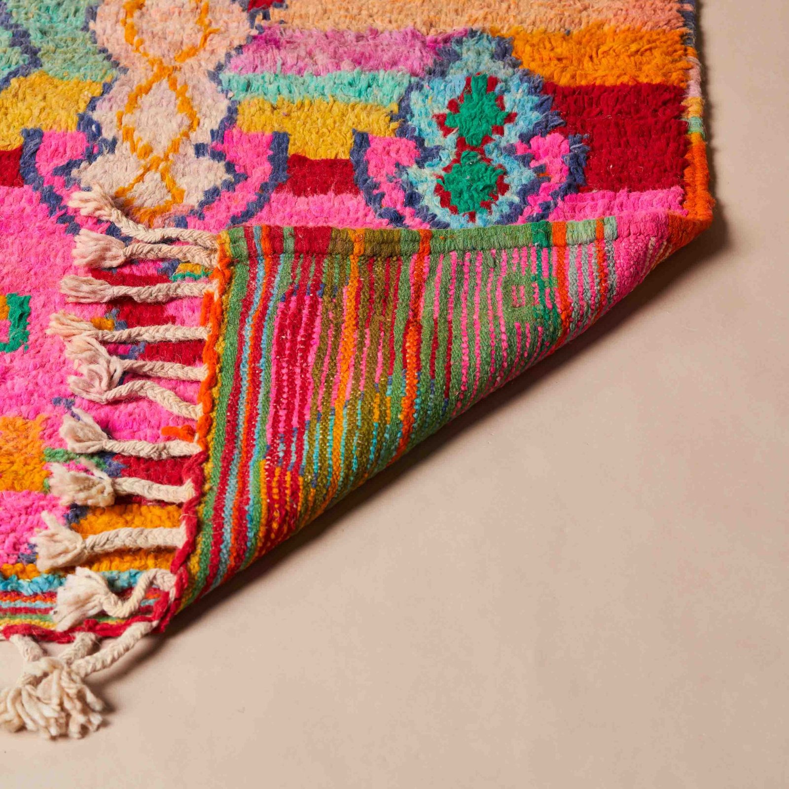 Boujaad is the small town in Morocco from which these typical rugs take their name. Also known as the "land of a thousand and one saints," Boujaad has for centuries been a spiritual destination for souls in search of religious teachings. Its mystical aura permeates these true works of art, celebrated for their vibrant and rich colors, traditionally dominated by red, orange, and pink, although today they can be found in a wide array of hues. The designs themselves astonish with their remarkable creativity, often stemming from the weaver's freedom to follow their heart and tell their own story, thereby weaving a unique narrative.