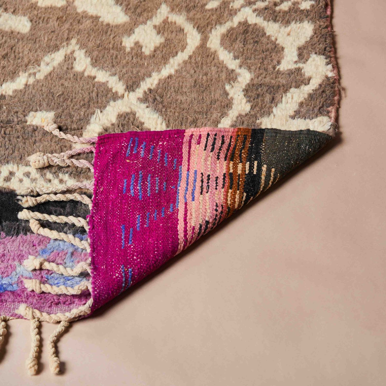 This elegant Moroccan Boujaad rug is a true testament to traditional Berber craftsmanship, entirely handmade from premium natural wool. Featuring a refined design in soft hues, it showcases geometric patterns and ancestral symbols that reflect centuries-old traditions and stories. The neutral tones of cream and deep brown blend seamlessly with various décor styles, making it a versatile addition to both modern and rustic spaces. Its soft yet durable texture enhances comfort and character, bringing a distinctive boho-chic touch. Perfect for those seeking authenticity and style through a unique piece with timeless charm.