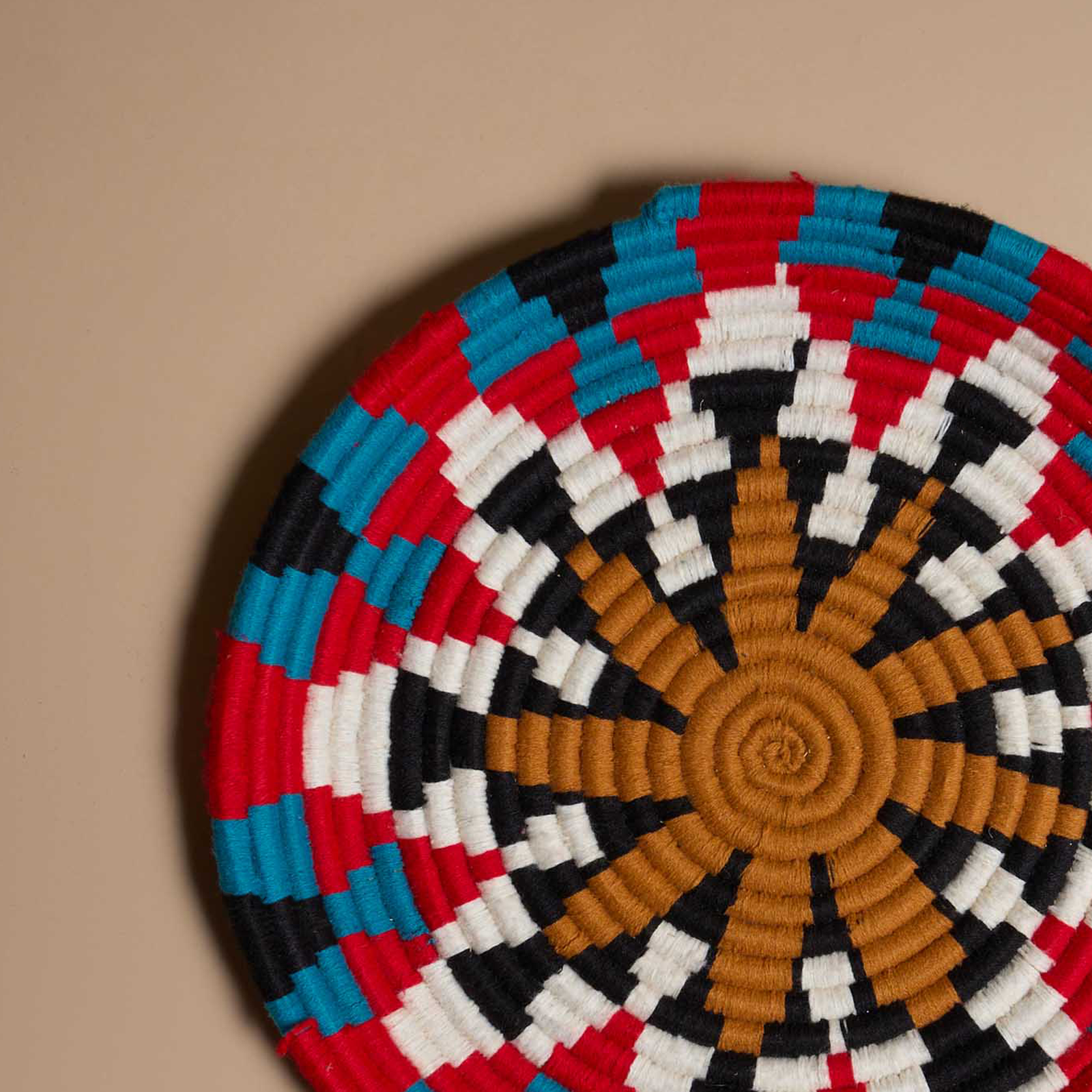 Cette assiette marocaine artisanale, réalisée en osier et en laine colorée, dévoile des nuances dynamiques de bleu, rouge et ocre. Les motifs géométriques traditionnels offrent un design vibrant et expressif, idéal pour apporter une touche d’originalité à tout environnement. Parfaite pour décorer murs, tables ou étagères, cette pièce artisanale marie tradition et créativité, insufflant à votre intérieur des couleurs riches et harmonieuses. Sa combinaison audacieuse de teintes en fait un objet décoratif unique, apportant chaleur, personnalité et le charme inimitable de l’artisanat marocain.