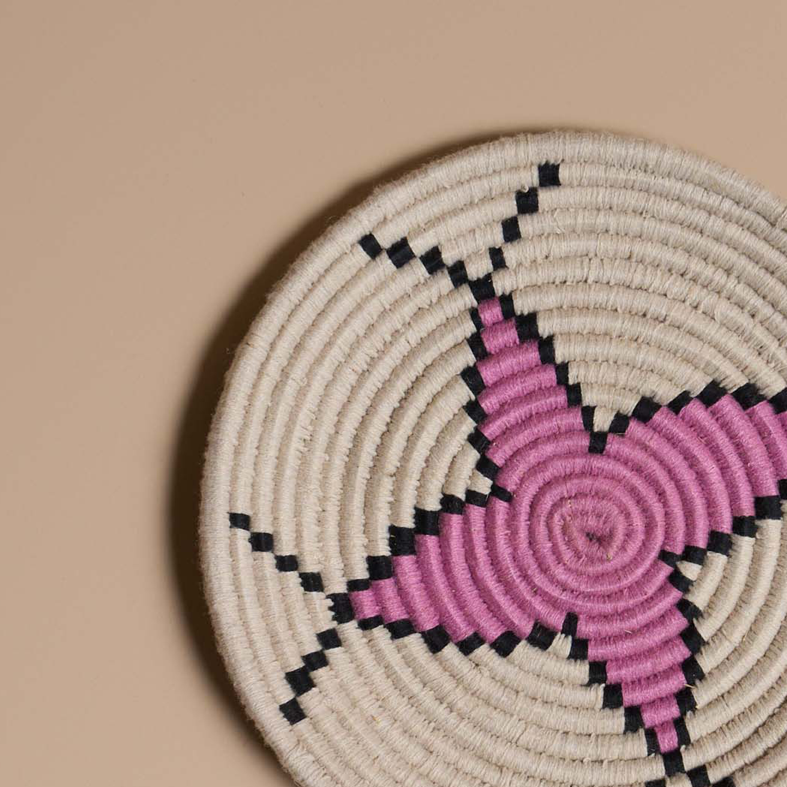 TVA incl.Piatto marocchino intrecciato a mano in vimini e lana colorata, con toni delicati di avorio e nero illuminati da rosa brillante. I motivi geometrici tradizionali creano un design elegante e armonioso. Perfetto per decorare pareti o tavoli, dona luminosità e stile, arricchendo ogni ambiente con fascino autentico.