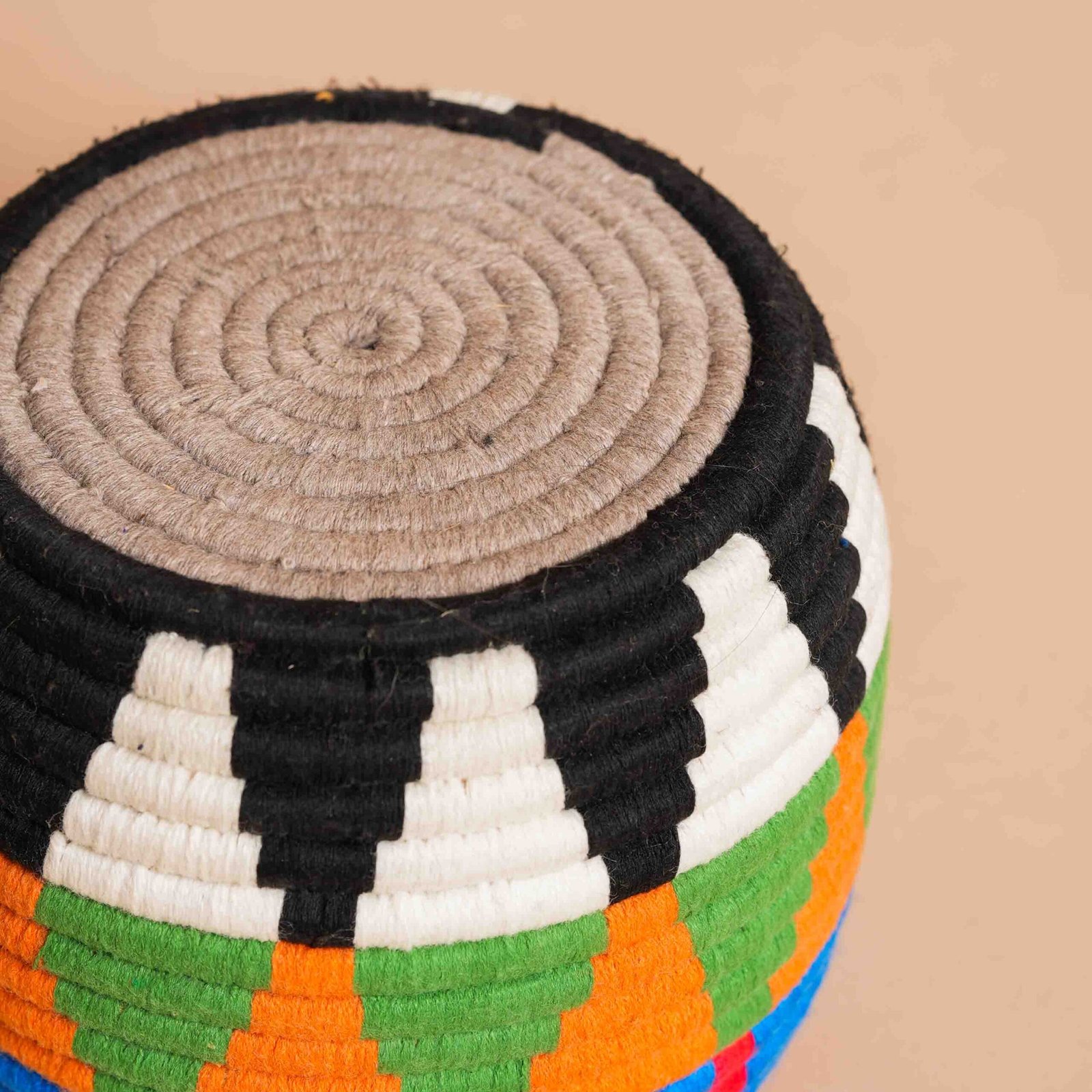 TVA incl.Ce vase berbère, réalisé à la main avec des fibres de palmier naturel, présente des teintes affirmées de rouge, d’azur, d’orange et de vert, créant un contraste vibrant et dynamique. Le design géométrique, tissé à l’aide de fils de laine, reflète l’artisanat traditionnel marocain, ajoutant couleur et style à tout espace.