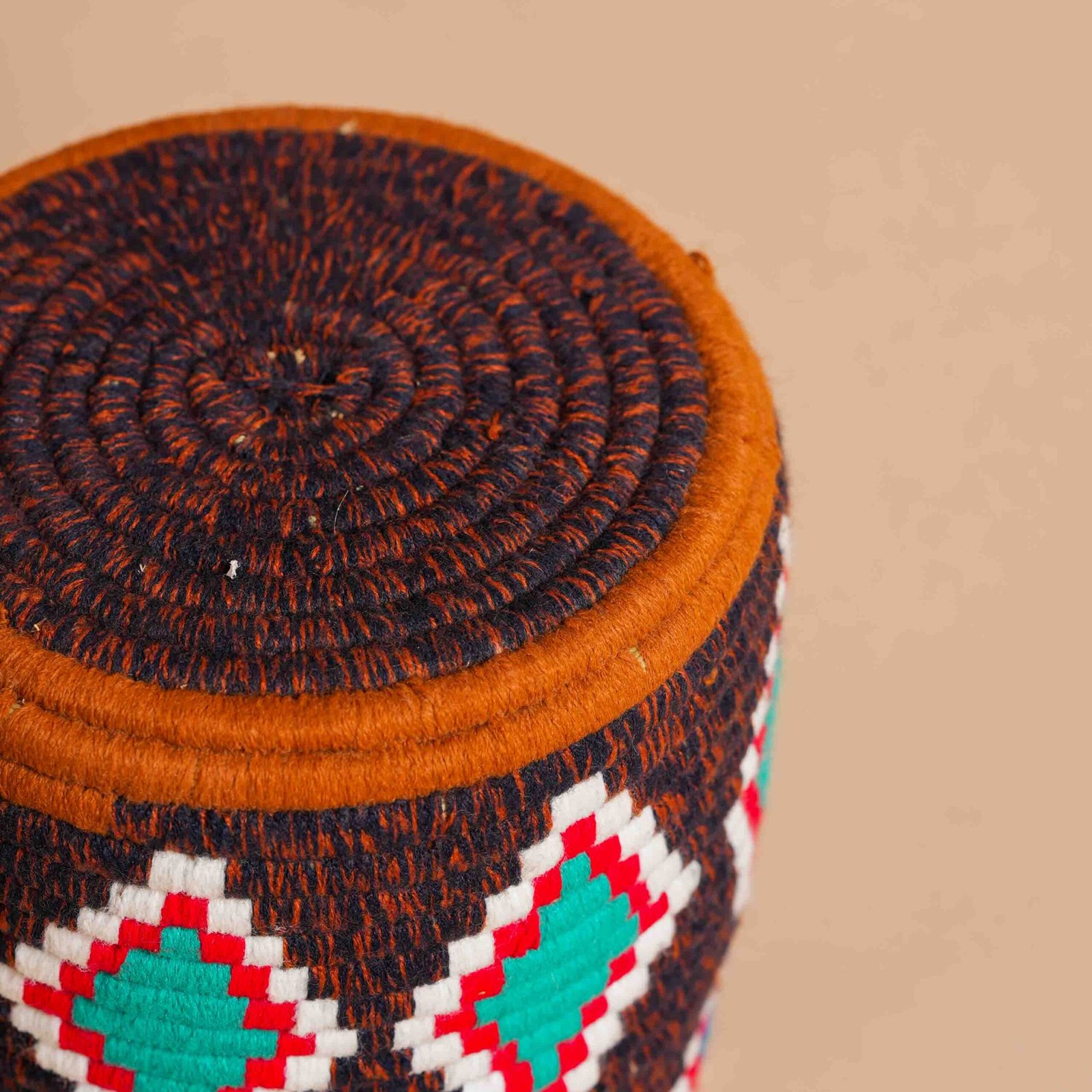 Ce vase berbère, confectionné à la main avec des fibres de palmier naturel, présente une combinaison fascinante de teintes de marron et de rouge, enrichie par des nuances d’azur qui créent un contraste visuellement captivant. Le design géométrique, orné de fils de laine, incarne l’authentique artisanat traditionnel marocain. Chaque détail reflète la maîtrise des tisserands berbères, alliant esthétique et fonctionnalité. Parfait pour ajouter une touche de couleur et de personnalité à tout espace, il peut être utilisé comme élément décoratif ou comme contenant pratique, apportant style et originalité à chaque pièce.