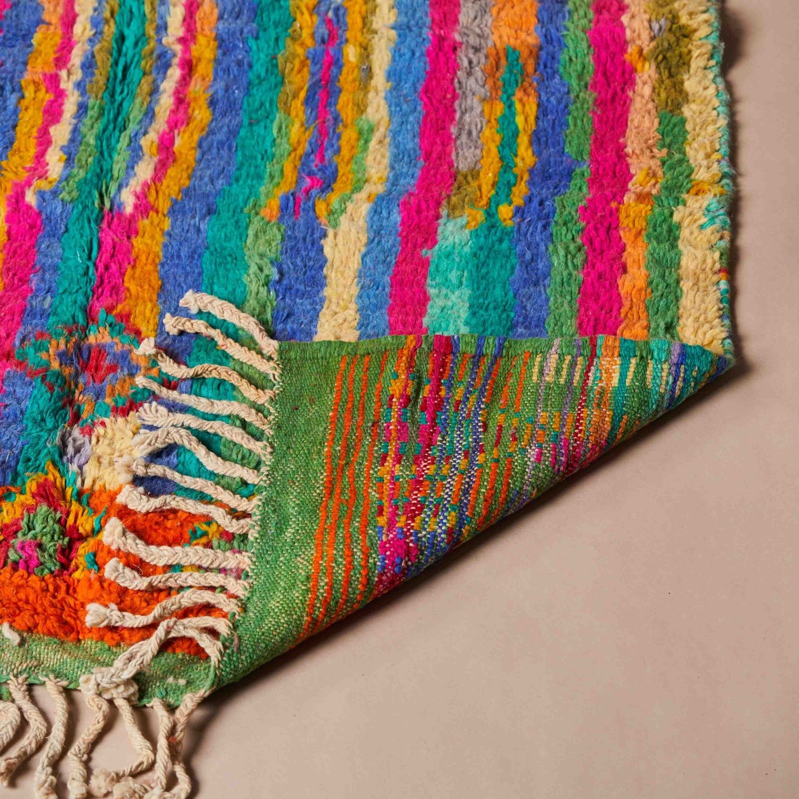 Véritable chef-d’œuvre de l'artisanat marocain, ce tapis Boujaad se distingue par ses rayures multicolores vives et ses motifs géométriques accrocheurs. Confectionné à la main avec une laine de qualité supérieure, il offre une texture à la fois douce et résistante, apportant une touche artistique et chaleureuse à toute pièce, du salon à la chambre.