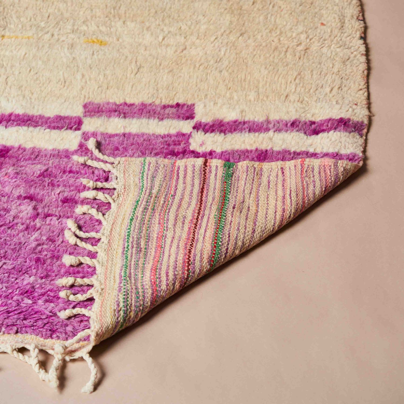 Ce tapis Boujaad marocain est un véritable chef-d’œuvre artisanal qui apporte chaleur et style à tout espace. Confectionné entièrement à la main avec une laine de haute qualité, il présente une combinaison harmonieuse de teintes vibrantes – jaune chaleureux, rose doux et accents saisissants de violet et de fuchsia. Son design géométrique abstrait ajoute mouvement et personnalité, ce qui en fait un choix idéal pour décorer aussi bien des intérieurs modernes que traditionnels. Parfait comme pièce maîtresse dans un salon, une chambre ou un espace de travail, il incarne l'authenticité marocaine et la beauté du savoir-faire local.