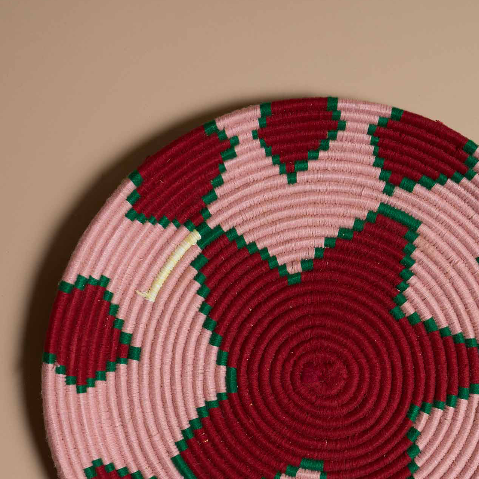 IVA incl.Piatto marocchino intrecciato a mano in vimini e lana colorata, con eleganti toni di rosso e rosa arricchiti da pennellate di verde. I motivi geometrici tradizionali creano un design armonioso e raffinato. Perfetto per decorare pareti o tavoli, dona calore e stile a qualsiasi ambiente con autenticità artigianale.
