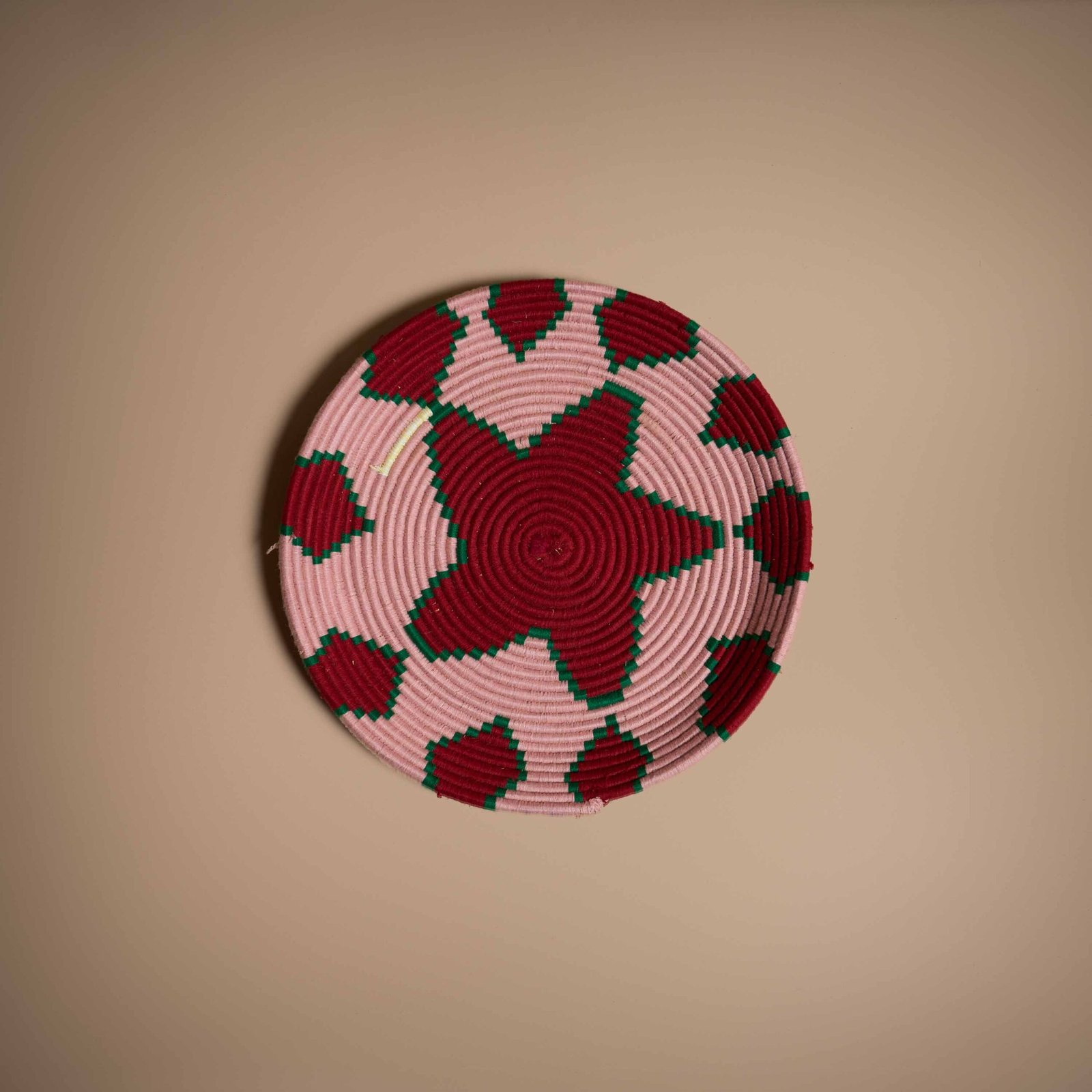 Piatto marocchino artigianale in vimini e lana colorata, caratterizzato da un’elegante combinazione di rosso e rosa, arricchita da toccate di verde. I motivi geometrici tradizionali donano un design armonioso e raffinato, perfetto per arricchire qualsiasi ambiente con un tocco di stile e autenticità. Ideale per decorare pareti, tavoli o mensole, questo piatto artigianale unisce tradizione e creatività, trasformando gli spazi con colori vivaci e ben bilanciati. La sua combinazione cromatica lo rende versatile e adatto a diversi stili d’arredo. Un complemento decorativo unico, capace di valorizzare ogni spazio con eleganza e l’inconfondibile fascino marocchino.