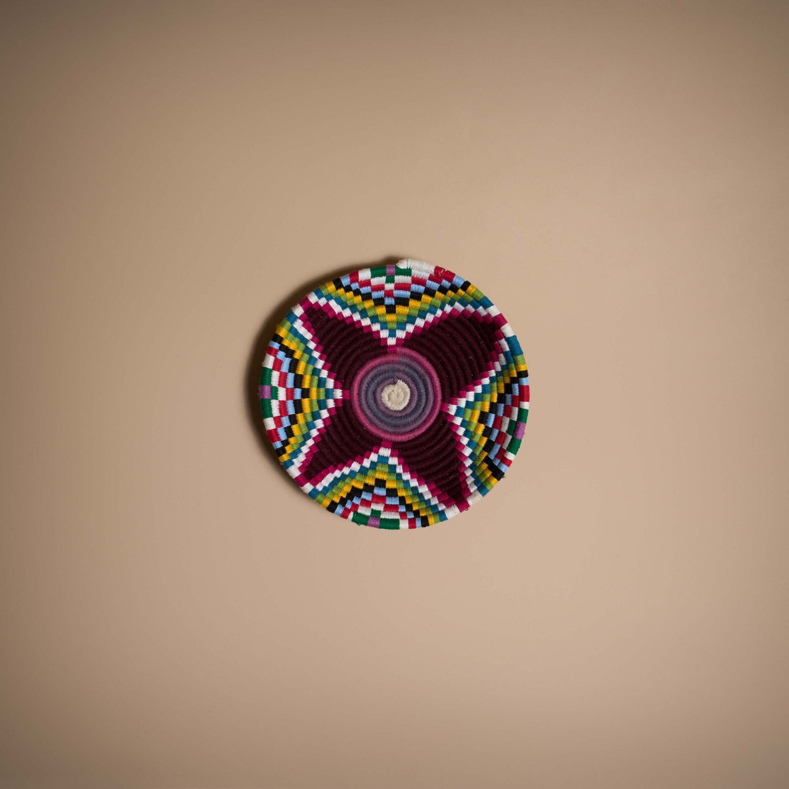 Piatto marocchino lavorato a mano in vimini e lana colorata, con un arcobaleno di colori vivaci. Diversi toni di rosa e verde si alternano a giallo e azzurro brillanti, creando un design dinamico e luminoso. Perfetto per decorare pareti o tavoli, dona energia e stile unico agli ambienti.