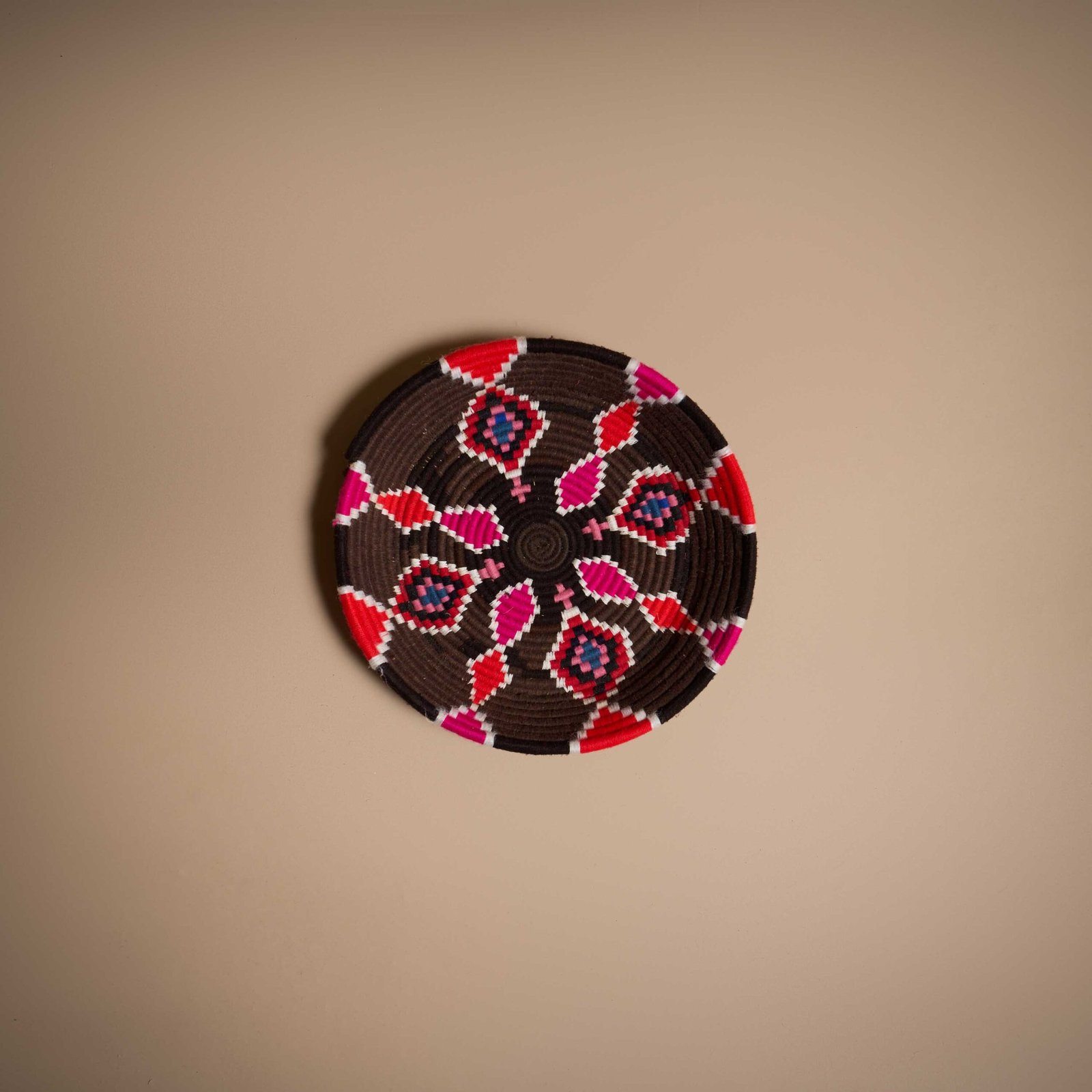 Piatto marocchino intrecciato a mano in vimini e lana colorata. I diversi toni di marrone, rosso, fucsia e azzurro caratterizzano motivi geometrici ispirati alla tradizione. Un complemento d’arredo raffinato che dona personalità agli spazi. Perfetto per decorare pareti o tavoli, crea un’atmosfera accogliente e autentica.