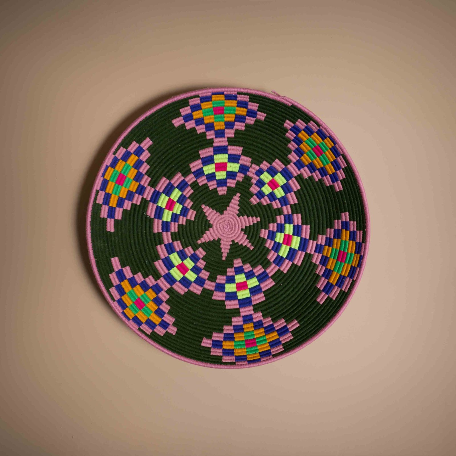 IVA incl.Questo piatto marocchino, realizzato in vimini e lana colorata, stupisce con una combinazione di colori e geometrie che creano l’illusione della tridimensionalità. Il design dinamico cattura lo sguardo, trasformando ogni spazio. Perfetto per decorare pareti o tavoli, aggiunge un tocco moderno, elegante e affascinante a qualsiasi ambiente.