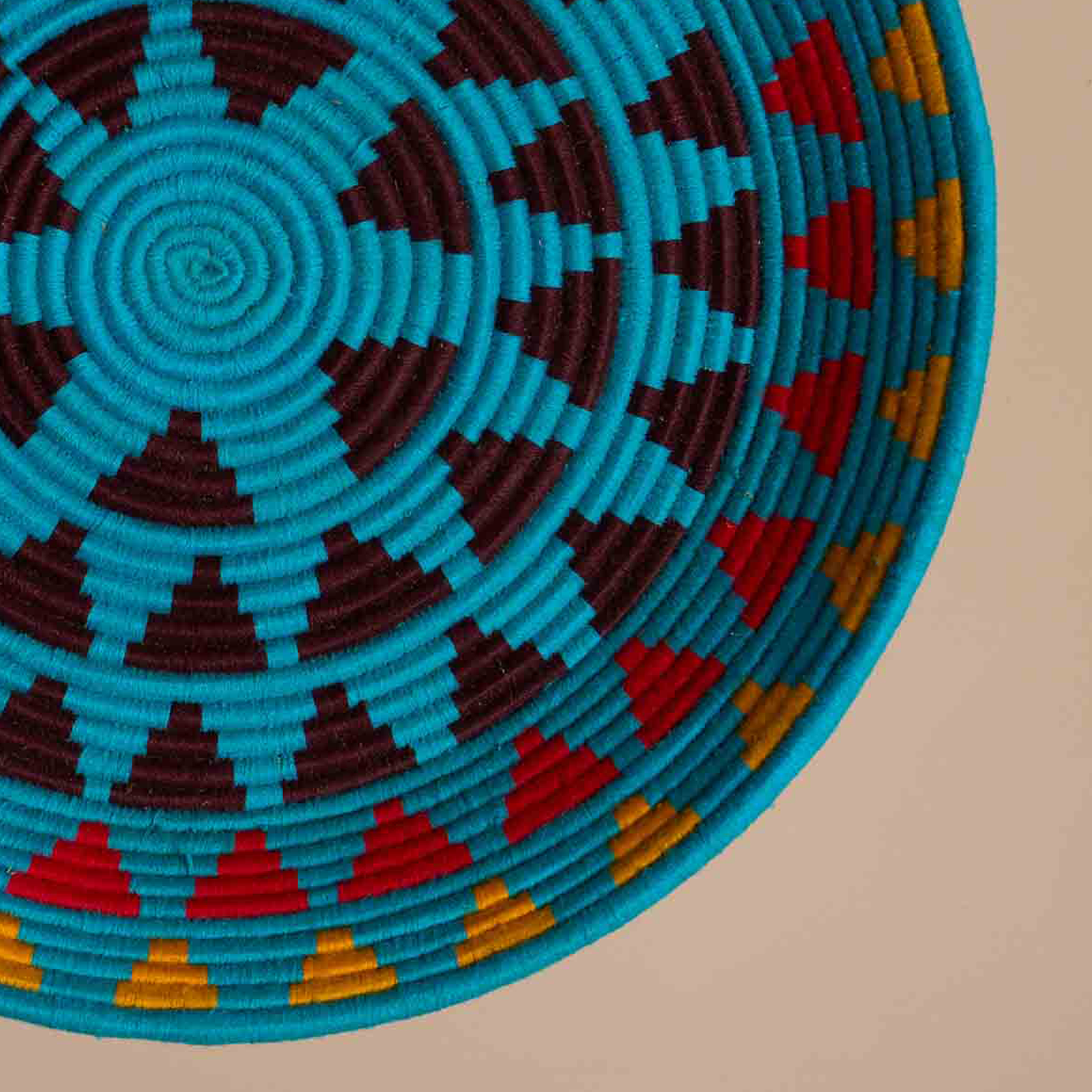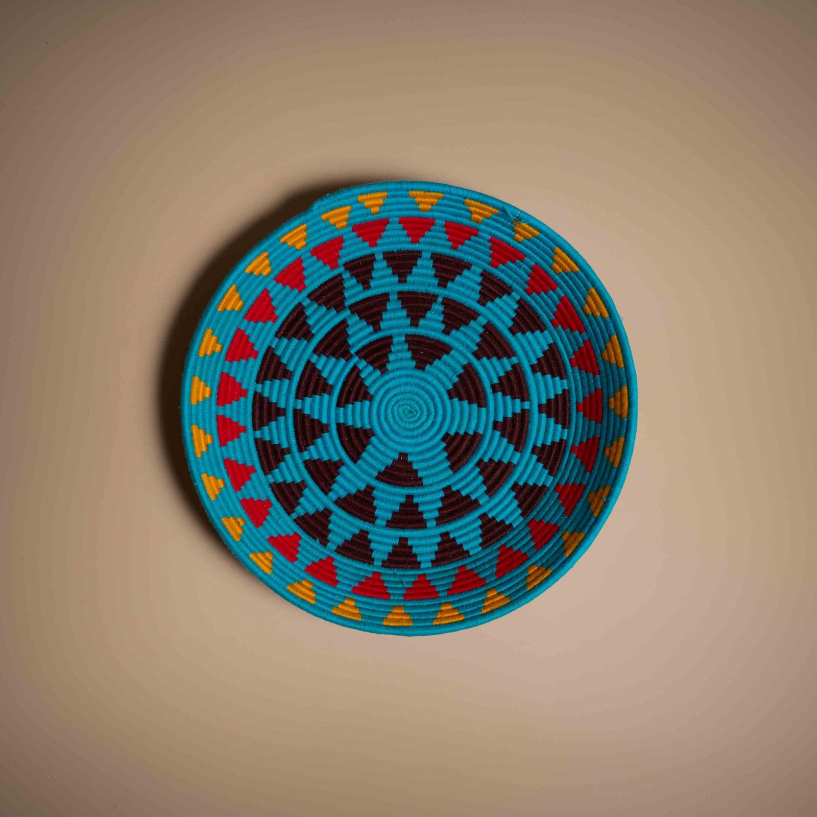 Piatto marocchino realizzato in vimini e lana colorata, caratterizzato da un motivo geometrico a triangoli gialli, rossi e borgogna su uno sfondo di cielo azzurro brillante. Questo design audace e dinamico porta vivacità e stile a qualsiasi ambiente. Perfetto per decorare pareti, tavoli o mensole, aggiunge colore e autenticità a spazi moderni o tradizionali. Un pezzo unico, frutto della maestria degli artigiani marocchini, che unisce la tradizione con l’innovazione. La combinazione di colori vivaci lo rende un complemento d’arredo versatile, capace di adattarsi a diversi stili e di valorizzare ogni angolo con un tocco di eleganza e personalità.