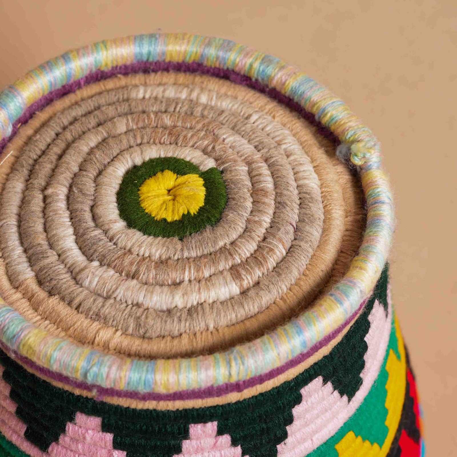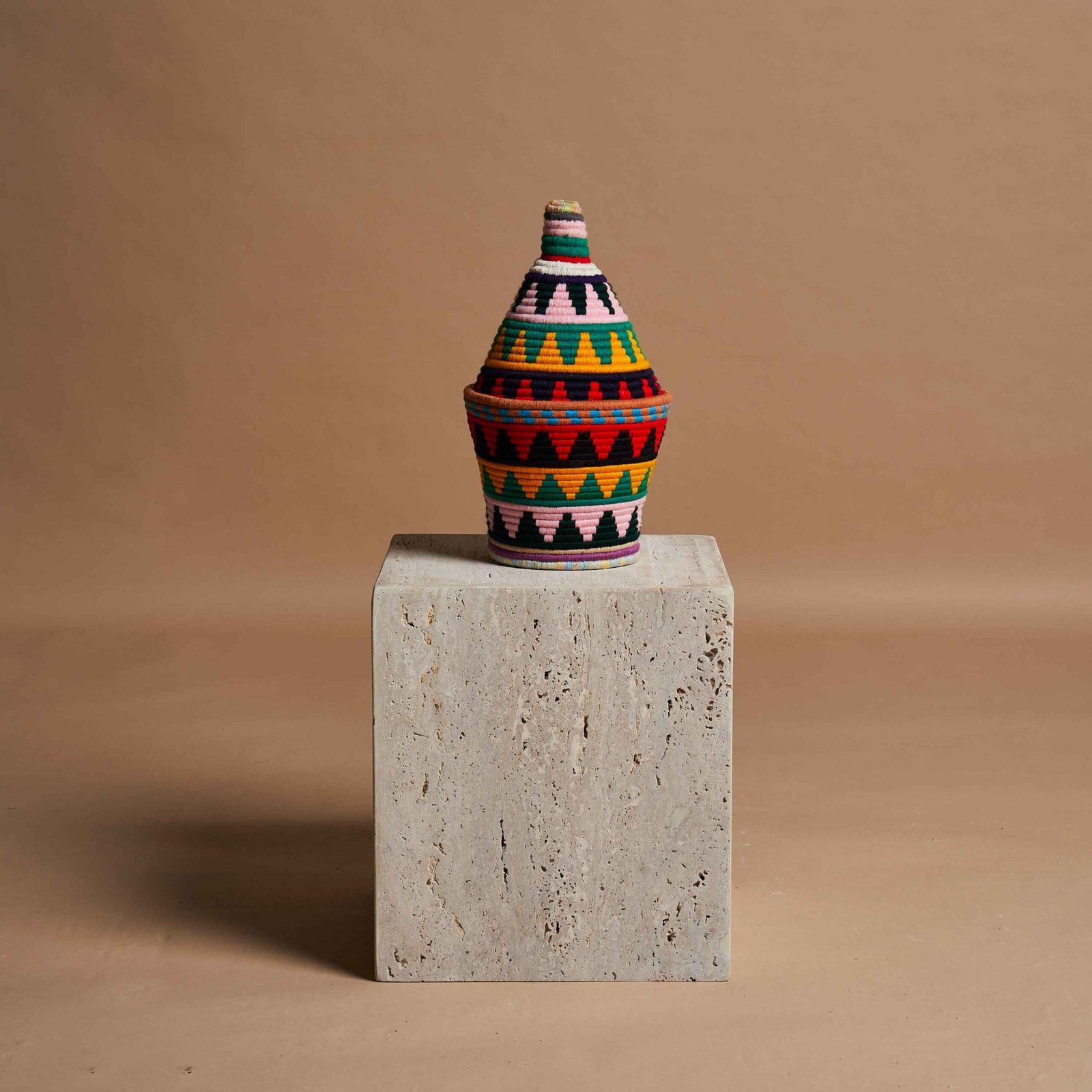 Questo vaso berbero intrecciato a mano, realizzato con fibre di palma naturale, sfoggia un design multicolor vivace e accattivante. I fili di lana colorati, che includono una varietà di tonalità brillanti, creano motivi geometrici tipici dello stile marocchino, tra cui triangoli e linee orizzontali. Il vaso, con la sua combinazione di colori, è ideale per aggiungere un tocco di energia e stile a qualsiasi ambiente. Perfetto per essere utilizzato come oggetto decorativo o per conservare oggetti quotidiani, unisce funzionalità e bellezza. La sua estetica unica e la tradizione artigianale marocchina lo rendono un pezzo distintivo per arredare con eleganza ogni spazio.