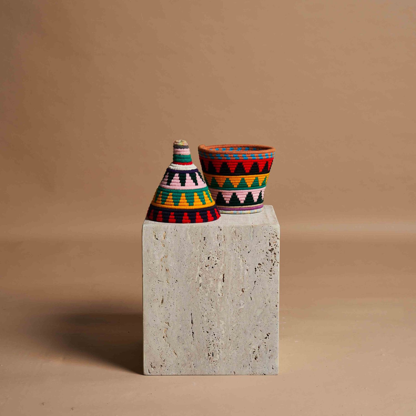 L’arte berbera di intrecciare a mano vasi con fibre di palma naturale e fili di lana colorata è un esempio straordinario di tradizione e innovazione. Ogni pezzo è realizzato con dedizione, combinando materiali semplici ma robusti per creare opere d’arte uniche. Le tonalità vivaci di lana, come il rosso, il blu e il verde, vengono intrecciate con precisione, formando motivi geometrici che riflettono la cultura e la storia del popolo berbero. Questi vasi non sono solo elementi decorativi, ma veri e propri testimoni di una maestria che trasmette autenticità, calore e un senso di connessione con la natura.