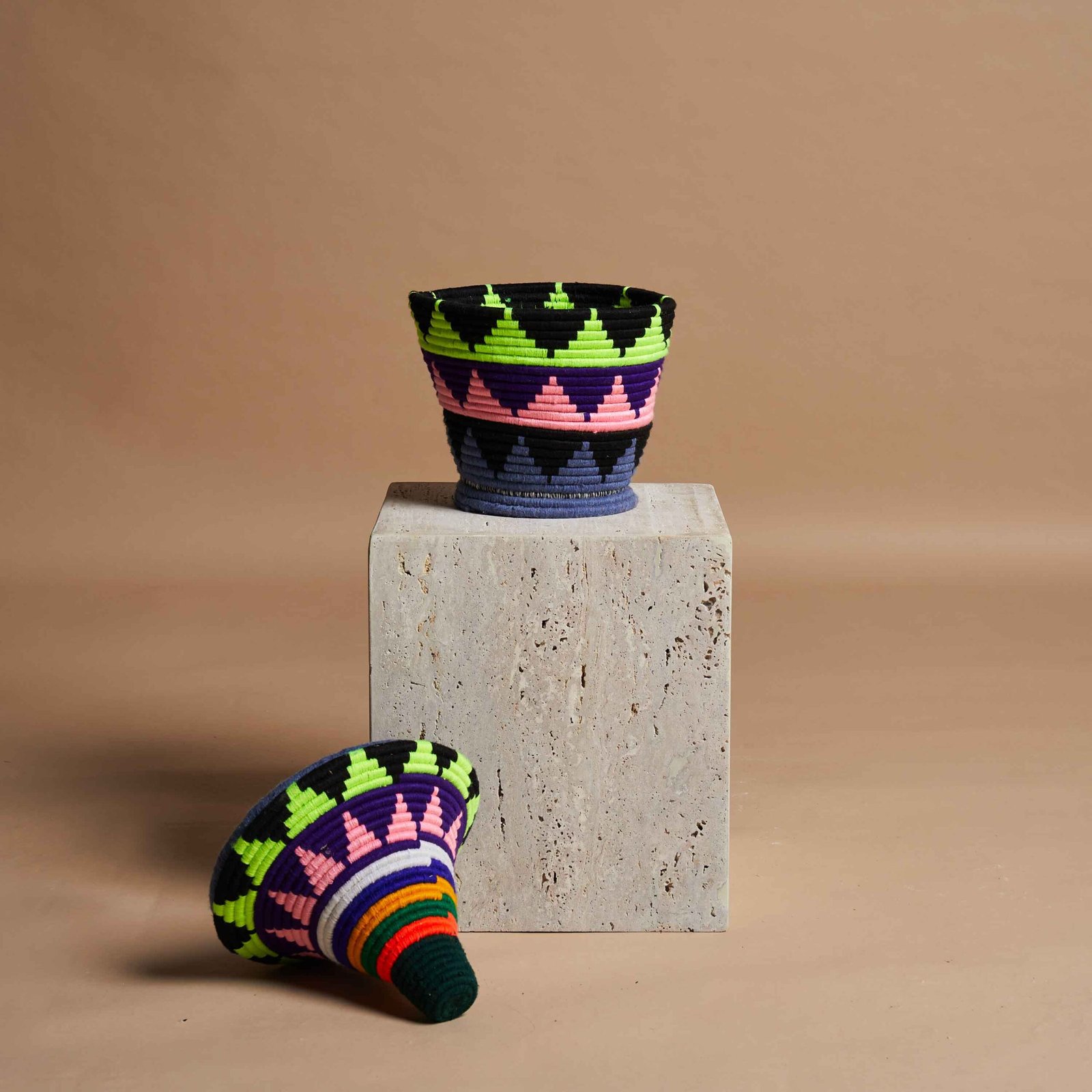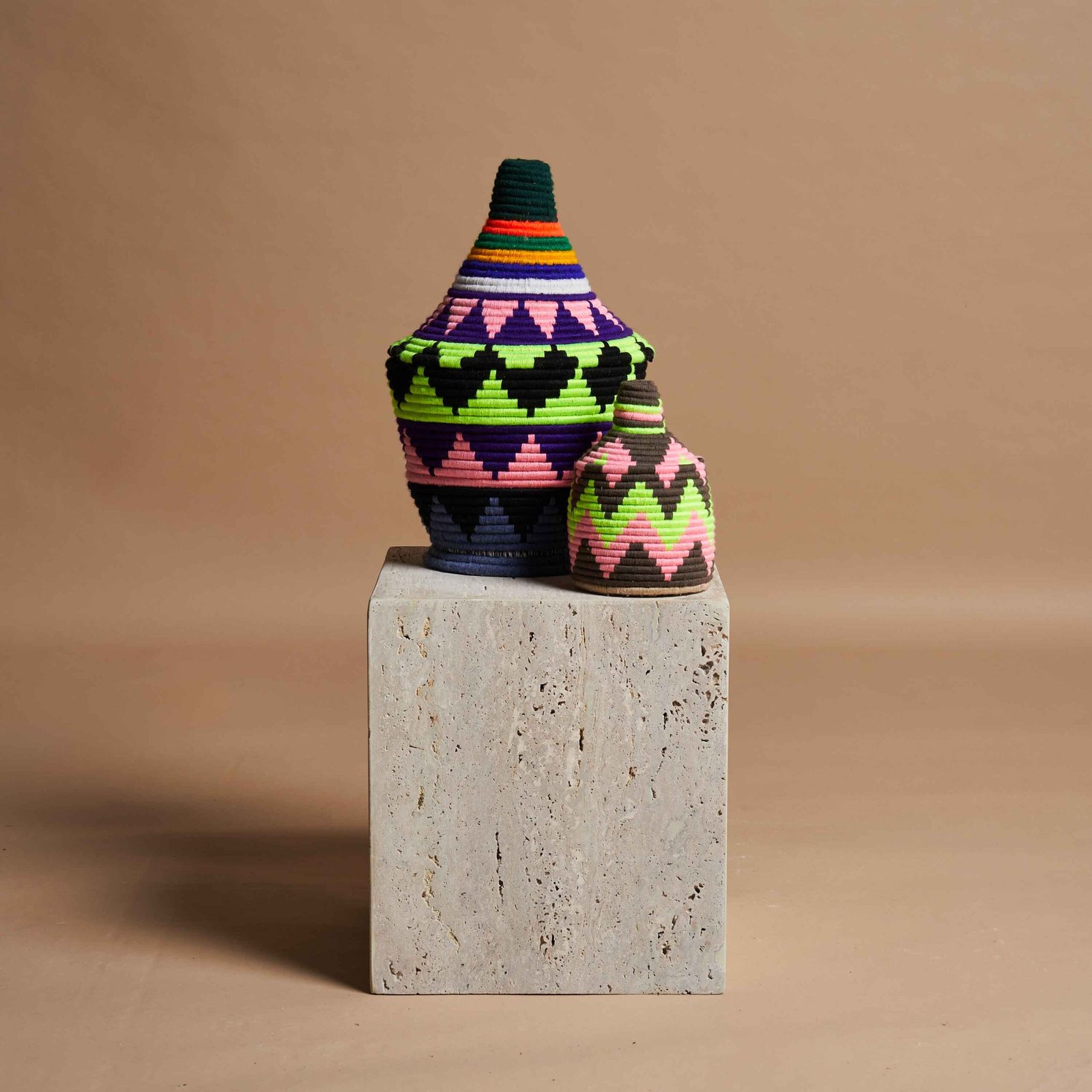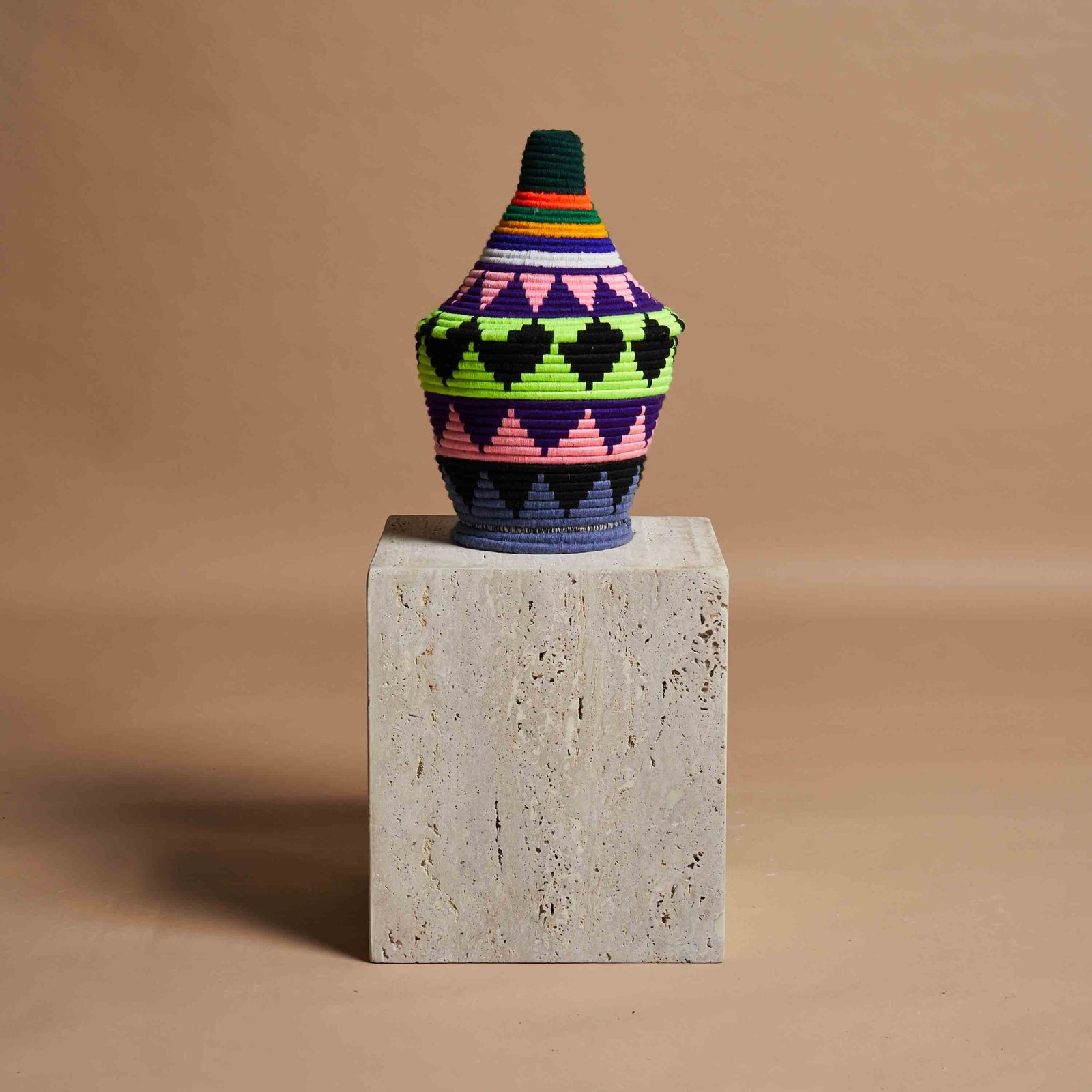 Questo vaso berbero intrecciato a mano è un esempio straordinario di artigianato tradizionale marocchino. Realizzato con fibre di palma naturale, è avvolto da colorati fili di lana che creano un motivo geometrico vivace e accattivante. Le tonalità dominanti includono il verde fluo, il rosa, il viola, il nero e il blu, con dettagli arancioni e gialli sulla parte superiore. Il design presenta una combinazione di triangoli e fasce orizzontali, tipici dello stile berbero, che conferiscono al vaso un aspetto dinamico ed elegante. Questo tipo di manufatto è spesso utilizzato per scopi decorativi o per conservare oggetti di uso quotidiano, rappresentando una perfetta fusione di funzionalità e bellezza artistica.