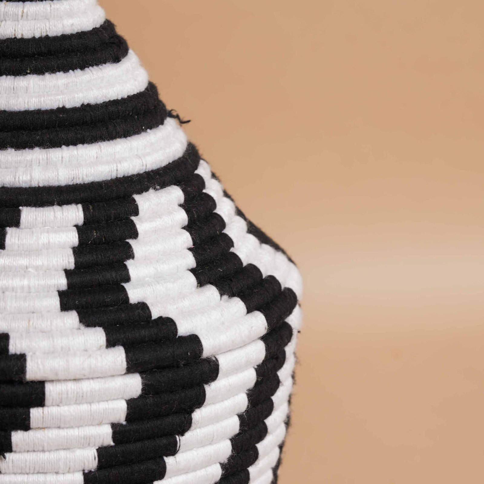 Questo vaso berbero intrecciato a mano, realizzato con fibre di palma naturale, presenta toni eleganti di nero e bianco, che creano un contrasto netto e distintivo. Il design geometrico, impreziosito da fili di lana, riflette la tradizione marocchina con motivi che richiamano lunghi zig-zag e fasce orizzontali. Perfetto per arredare con stile ogni ambiente, il vaso unisce funzionalità e estetica, diventando un elemento decorativo raffinato. Utilizzabile sia come contenitore per oggetti quotidiani che come oggetto decorativo, questo vaso rappresenta una fusione unica di artigianato tradizionale e design moderno, aggiungendo un tocco di classe a qualsiasi spazio.