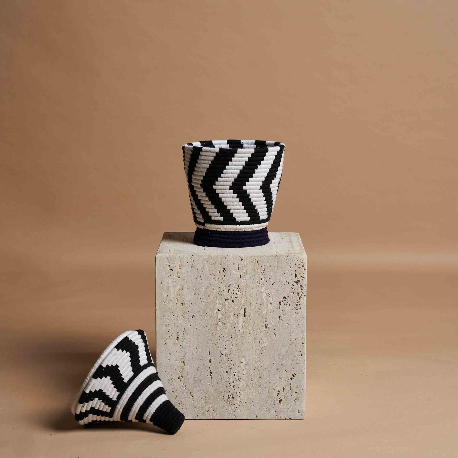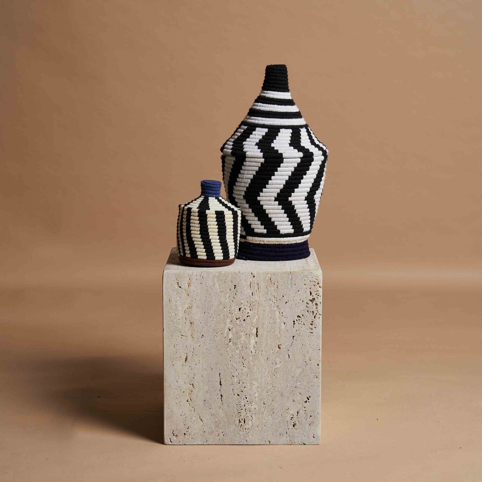 L’arte berbera di intrecciare a mano vasi con fibre di palma naturale e fili di lana colorata è un esempio straordinario di tradizione e innovazione. Ogni pezzo è realizzato con dedizione, combinando materiali semplici ma robusti per creare opere d’arte uniche. Le tonalità vivaci di lana, come il rosso, il blu e il verde, vengono intrecciate con precisione, formando motivi geometrici che riflettono la cultura e la storia del popolo berbero. Questi vasi non sono solo elementi decorativi, ma veri e propri testimoni di una maestria che trasmette autenticità, calore e un senso di connessione con la natura.