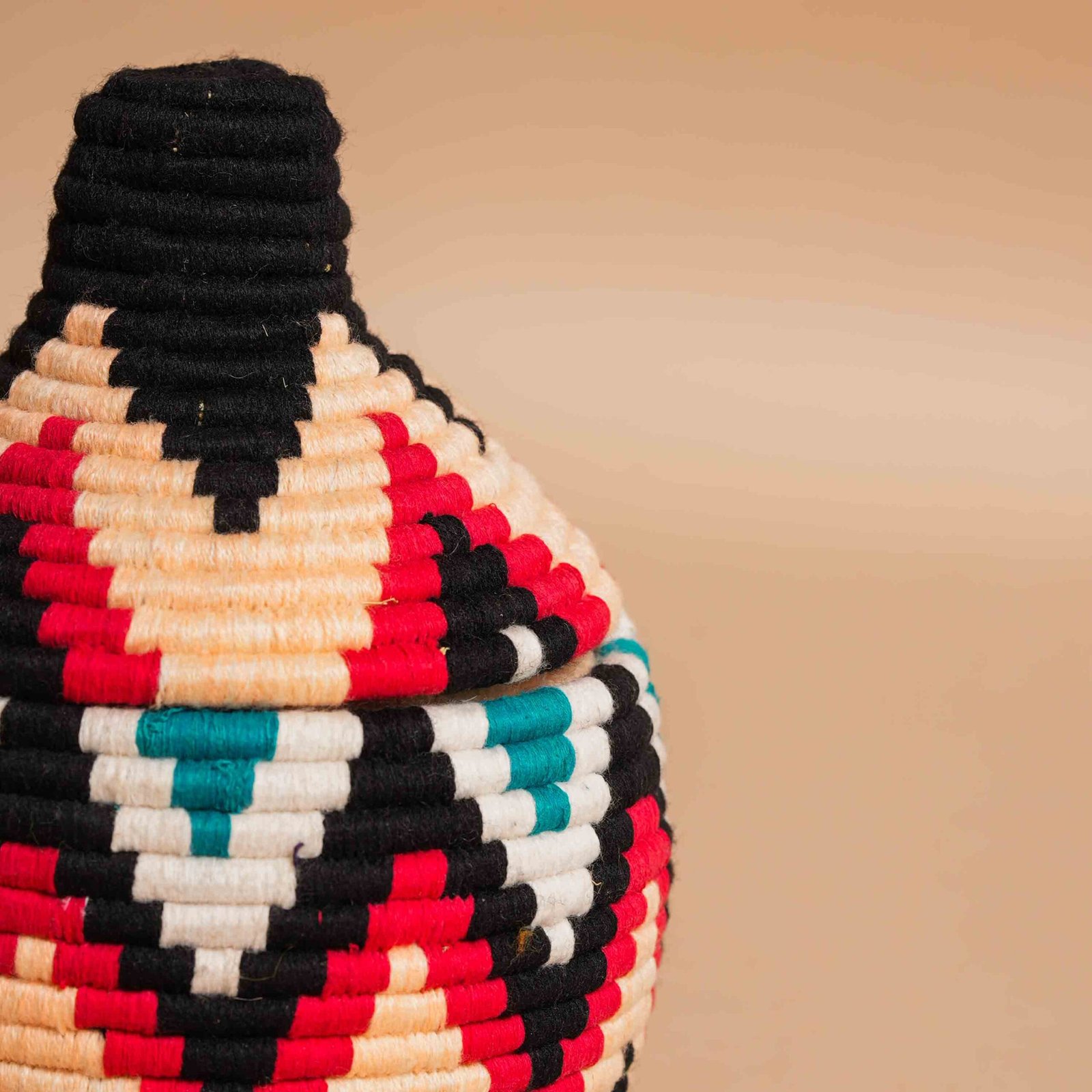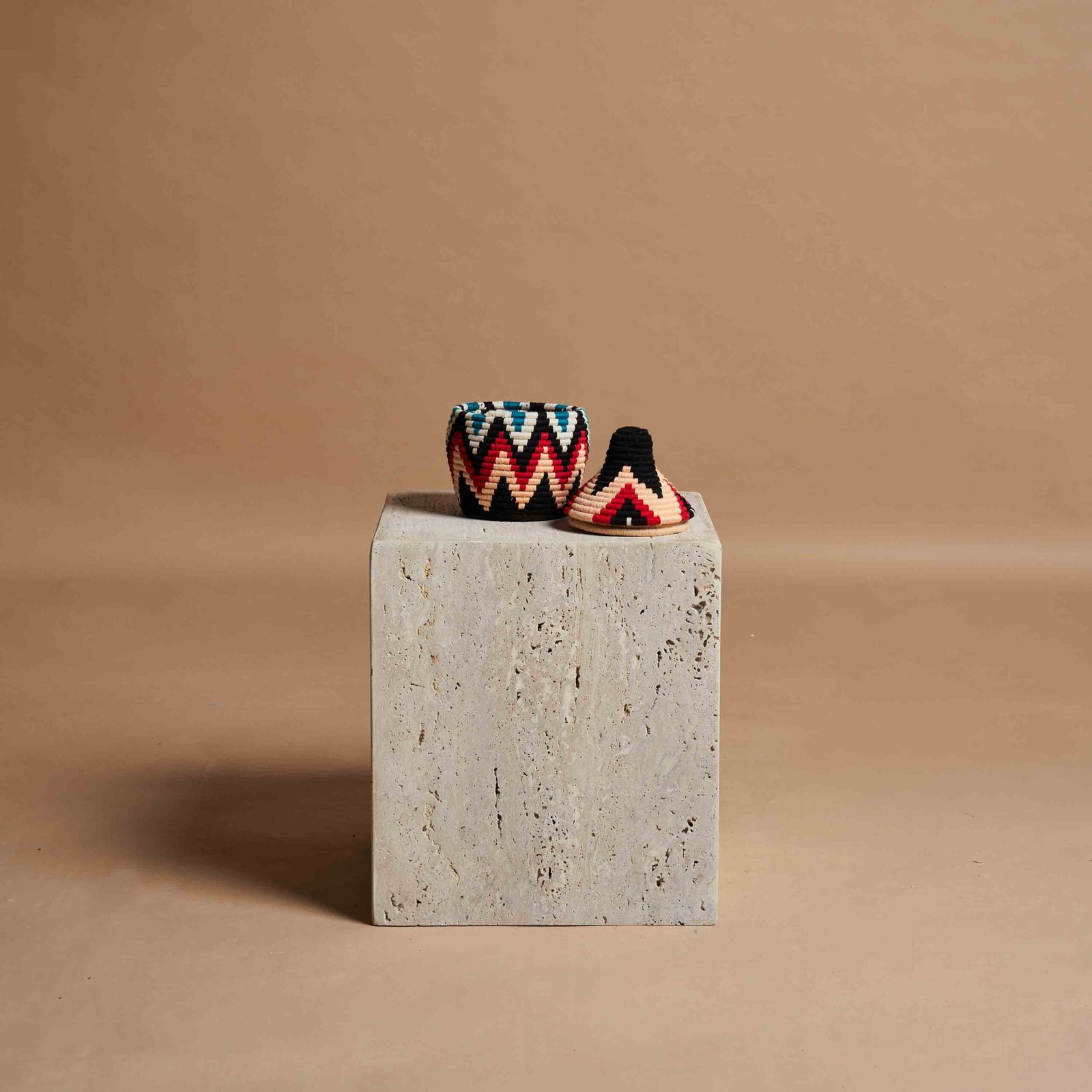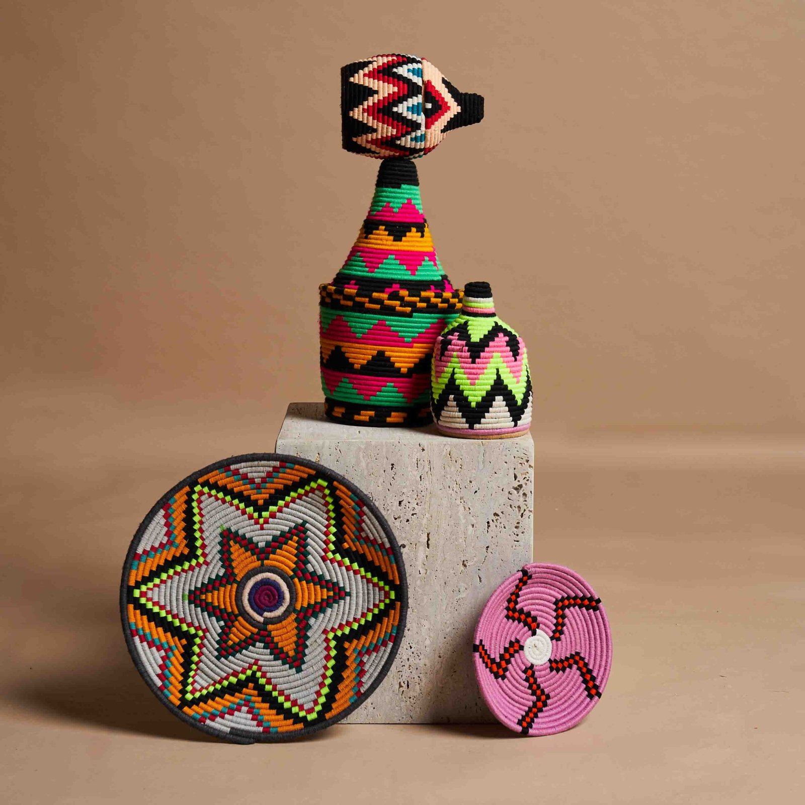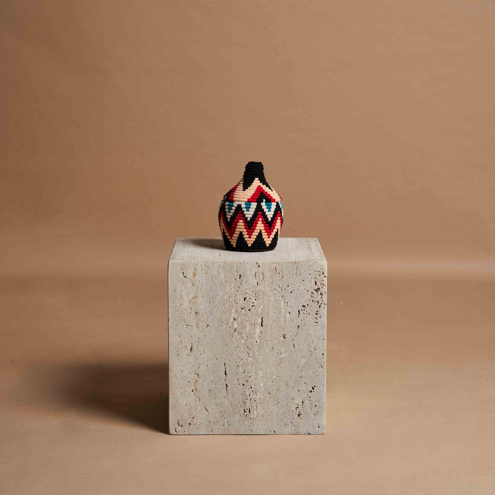 L’arte berbera di intrecciare a mano vasi con fibre di palma naturale e fili di lana colorata è un esempio straordinario di tradizione e innovazione. Ogni pezzo è realizzato con dedizione, combinando materiali semplici ma robusti per creare opere d’arte uniche. Le tonalità vivaci di lana, come il rosso, il blu e il verde, vengono intrecciate con precisione, formando motivi geometrici che riflettono la cultura e la storia del popolo berbero. Questi vasi non sono solo elementi decorativi, ma veri e propri testimoni di una maestria che trasmette autenticità, calore e un senso di connessione con la natura.