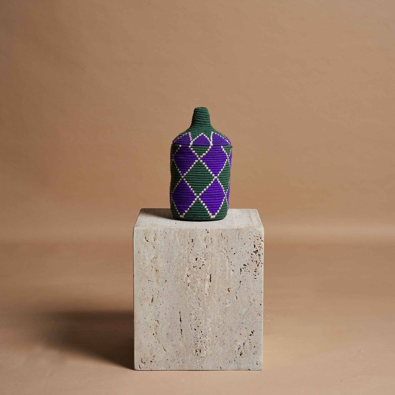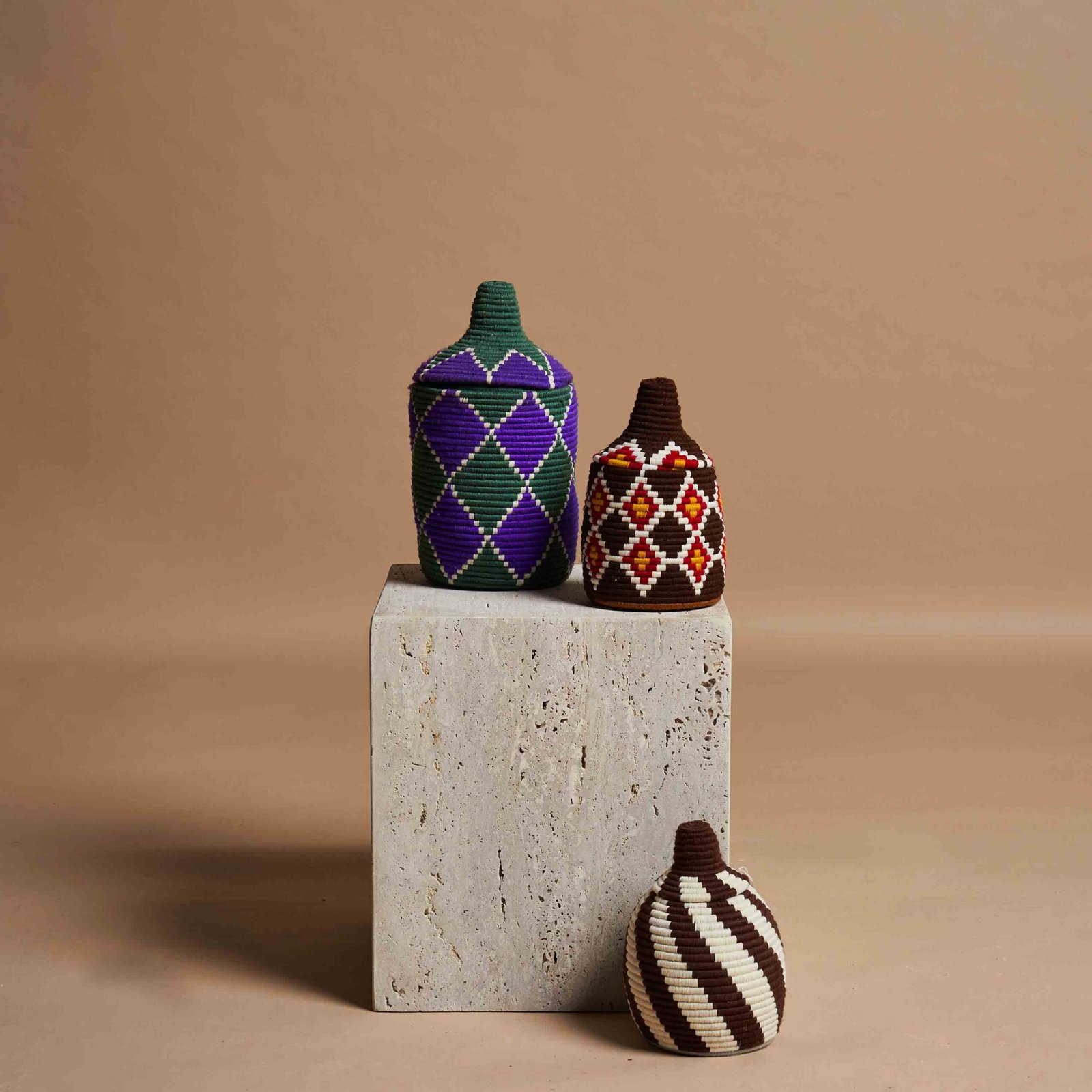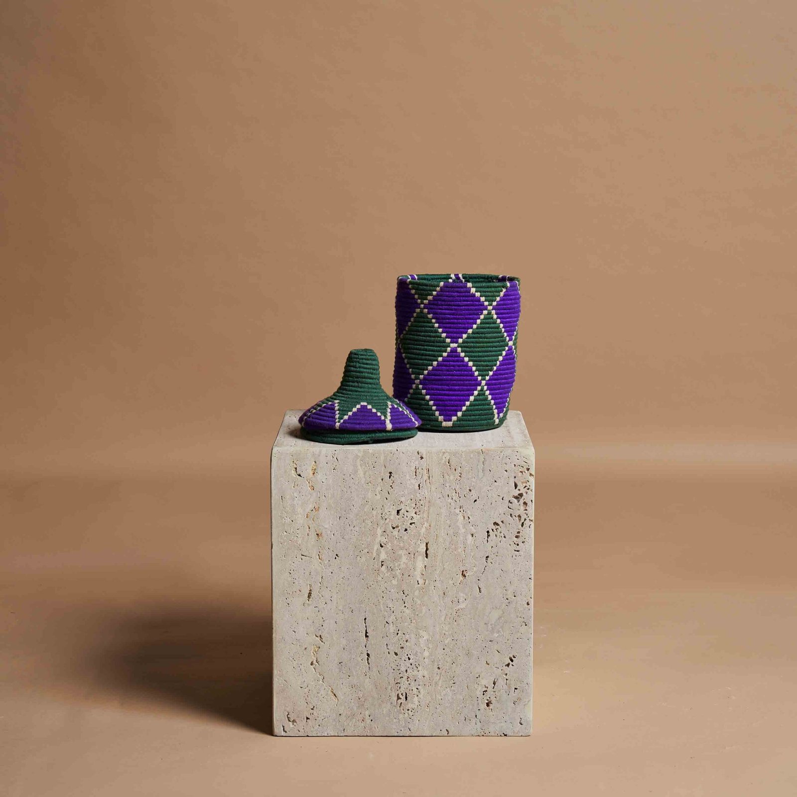 L’arte berbera di intrecciare a mano vasi con fibre di palma naturale e fili di lana colorata è un esempio straordinario di tradizione e innovazione. Ogni pezzo è realizzato con dedizione, combinando materiali semplici ma robusti per creare opere d’arte uniche. Le tonalità vivaci di lana, come il rosso, il blu e il verde, vengono intrecciate con precisione, formando motivi geometrici che riflettono la cultura e la storia del popolo berbero. Questi vasi non sono solo elementi decorativi, ma veri e propri testimoni di una maestria che trasmette autenticità, calore e un senso di connessione con la natura.
