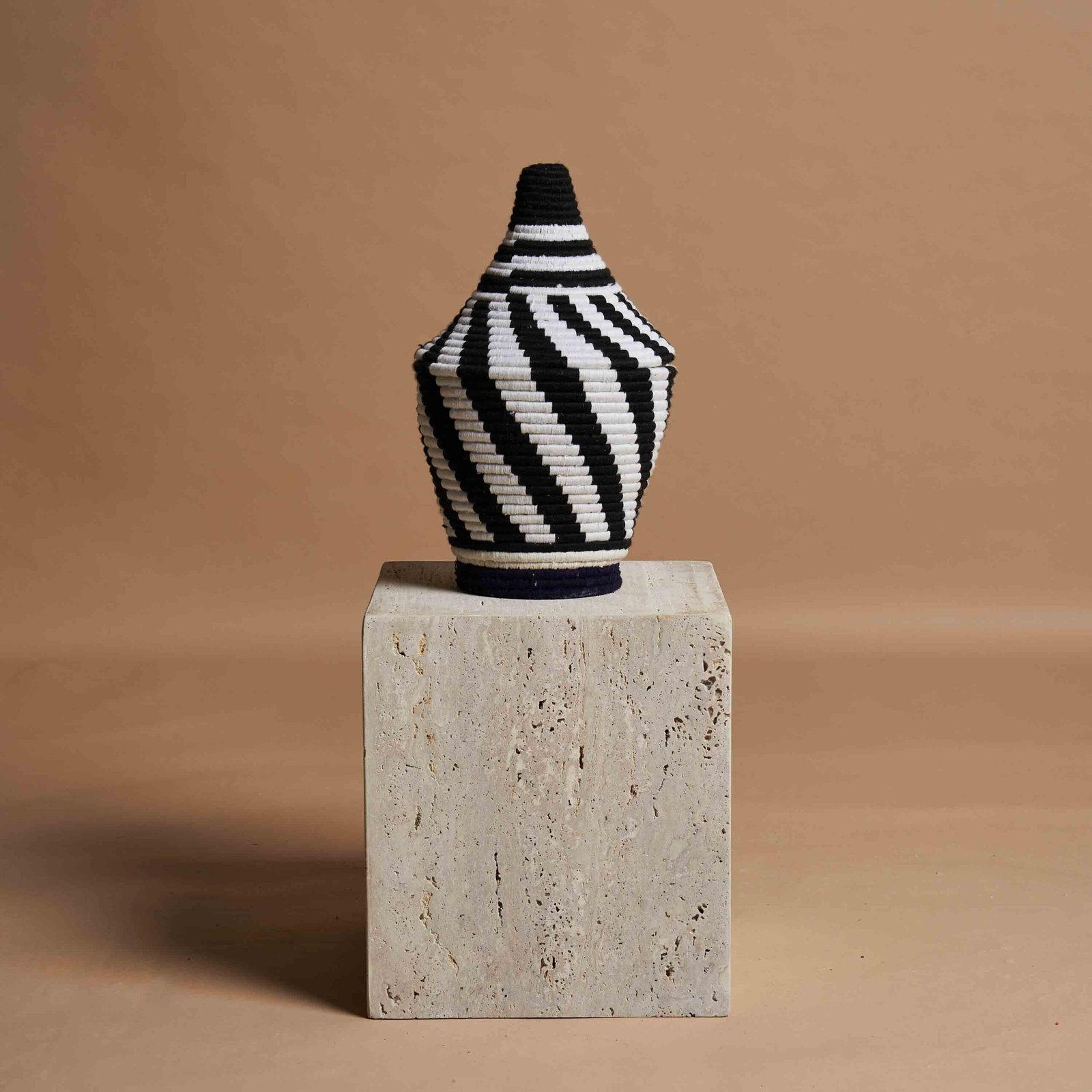 Questo vaso berbero intrecciato artigianalmente, realizzato con fibre di palma naturale, sfoggia toni eleganti di nero e bianco, creando un contrasto raffinato e ipnotico. Il design geometrico, arricchito da fili di lana, è un omaggio alla tradizione marocchina, con motivi che richiamano onde e fasce orizzontali. Perfetto per arredare con stile ogni ambiente, il vaso unisce funzionalità e bellezza, diventando un pezzo distintivo per chi cerca un tocco di classe. Ideale come elemento decorativo o come contenitore per oggetti quotidiani, rappresenta una fusione di tradizione artigianale e design moderno, arricchendo ogni spazio.