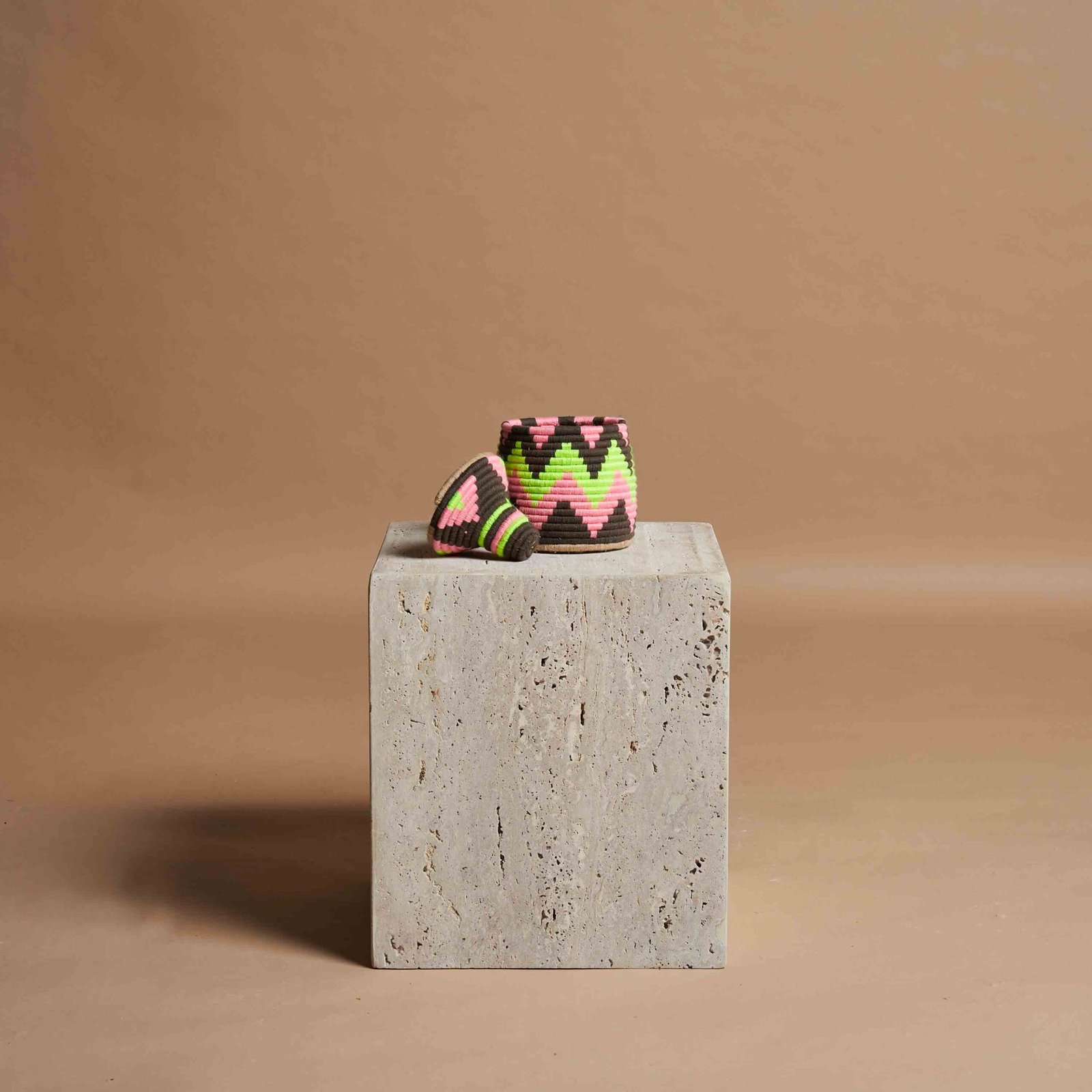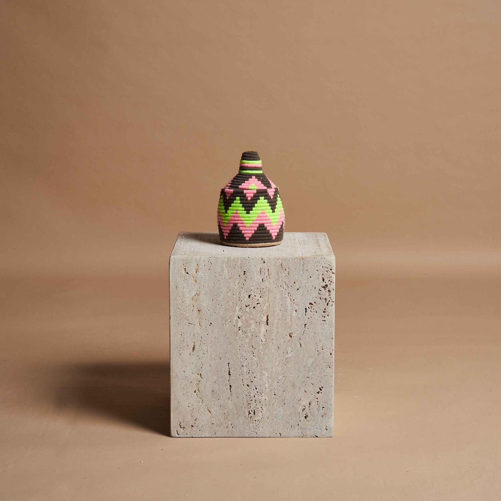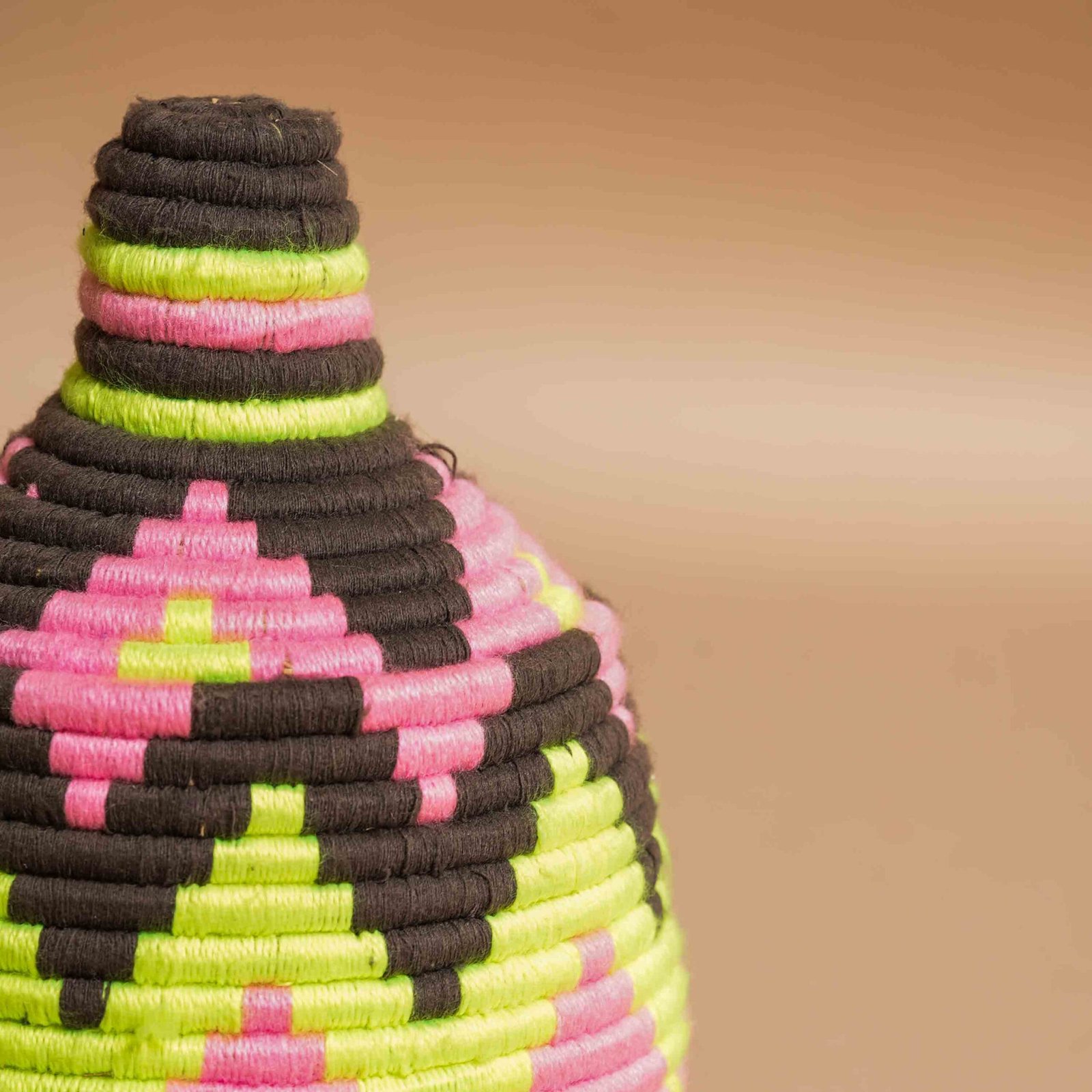 Questo vaso berbero intrecciato a mano unisce tradizione e design etnico. Realizzato con fibre di palma naturale e avvolto da fili di lana nei toni del rosa, verde fluo e marrone, aggiunge un tocco boho chic a ogni ambiente. Perfetto per un home decor sostenibile, celebra l’artigianato marocchino con uno stile unico e autentico.