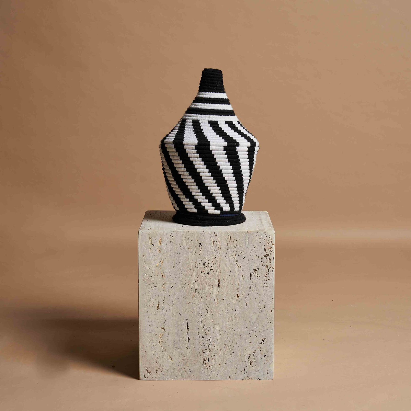 Questo vaso berbero intrecciato a mano, realizzato con fibre di palma naturale, presenta toni monocromatici di nero e bianco, creando un contrasto elegante e senza tempo. Il design geometrico, arricchito da fili di lana, riflette l’autentica tradizione marocchina, con motivi che richiamano linee oblique e fasce orizzontali. Perfetto per aggiungere un tocco di stile a qualsiasi ambiente, questo vaso unisce funzionalità e bellezza. Può essere utilizzato come elemento decorativo o per conservare oggetti quotidiani, portando un pezzo di artigianato marocchino unico e distintivo in ogni spazio. Un’opzione ideale per chi cerca un design sofisticato e originale.