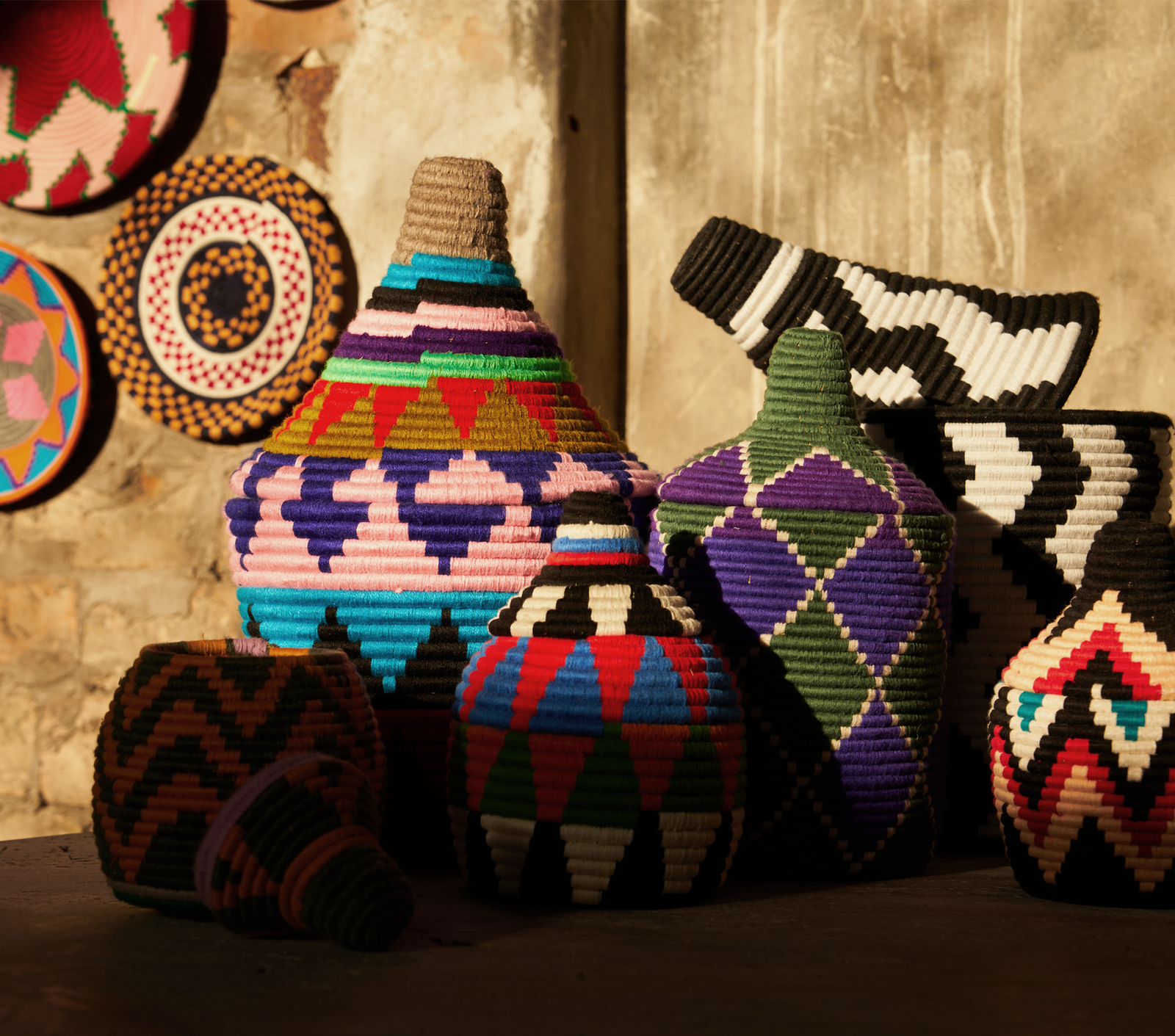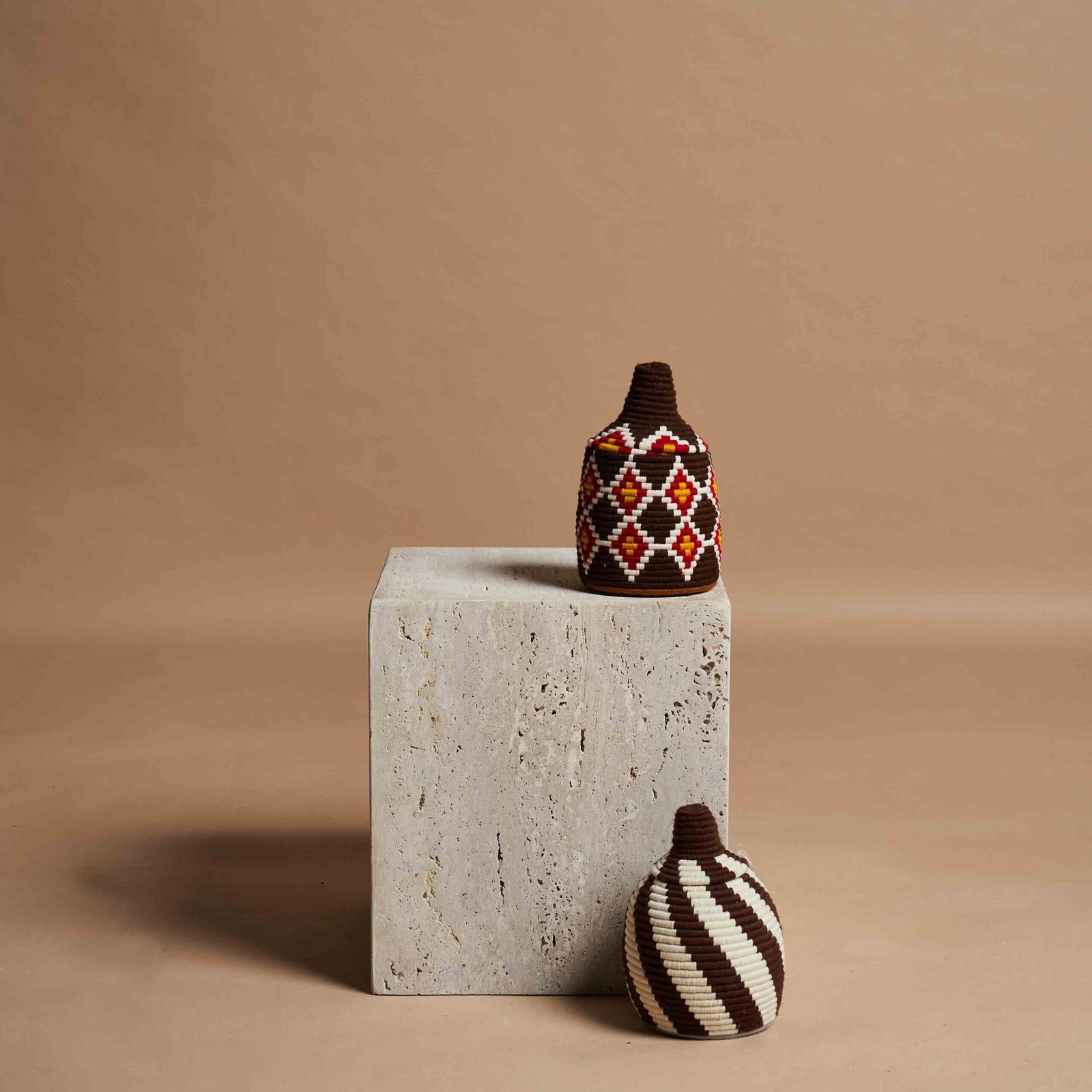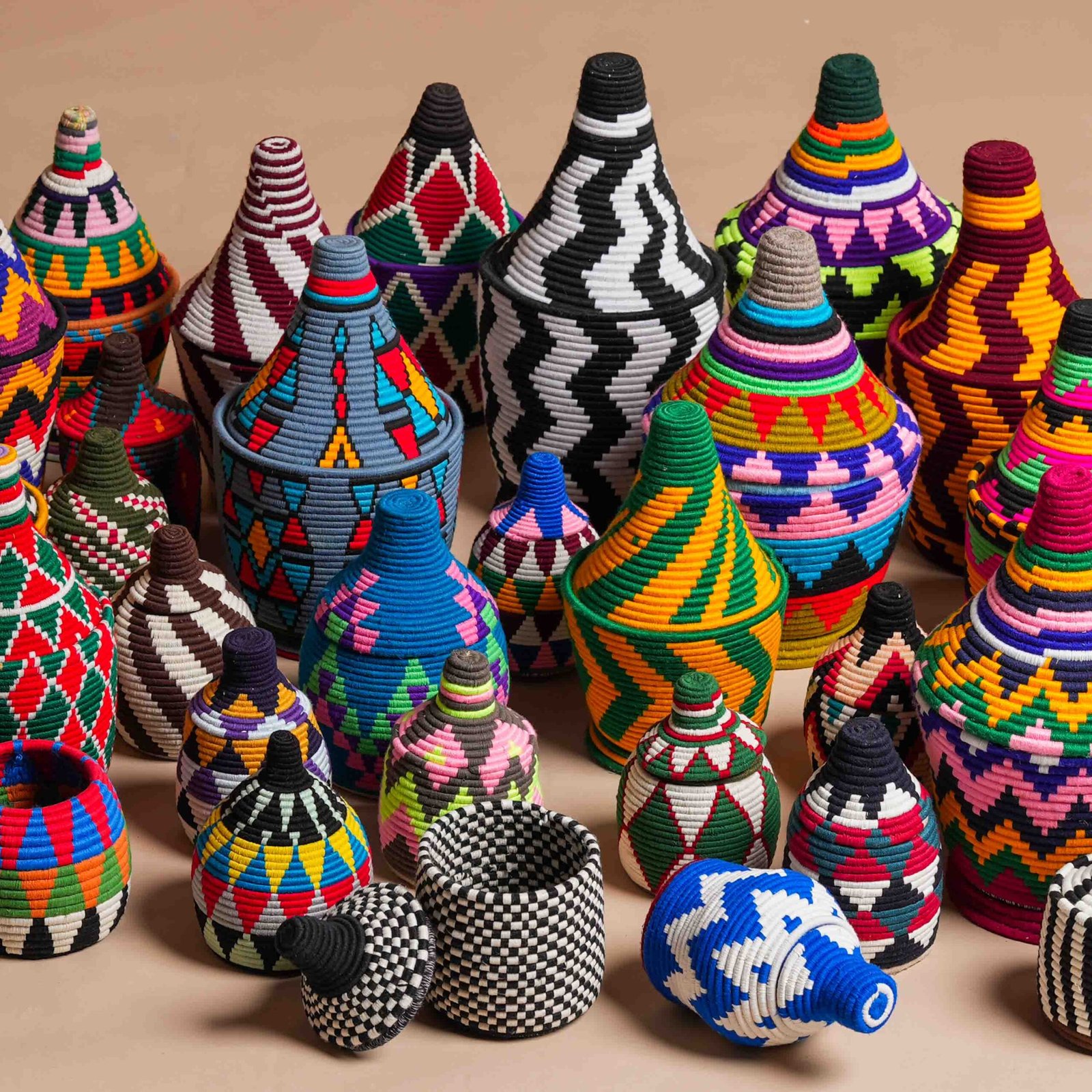 L’arte berbera di intrecciare a mano vasi con fibre di palma naturale e fili di lana colorata è un esempio straordinario di tradizione e innovazione. Ogni pezzo è realizzato con dedizione, combinando materiali semplici ma robusti per creare opere d’arte uniche. Le tonalità vivaci di lana, come il rosso, il blu e il verde, vengono intrecciate con precisione, formando motivi geometrici che riflettono la cultura e la storia del popolo berbero. Questi vasi non sono solo elementi decorativi, ma veri e propri testimoni di una maestria che trasmette autenticità, calore e un senso di connessione con la natura.
