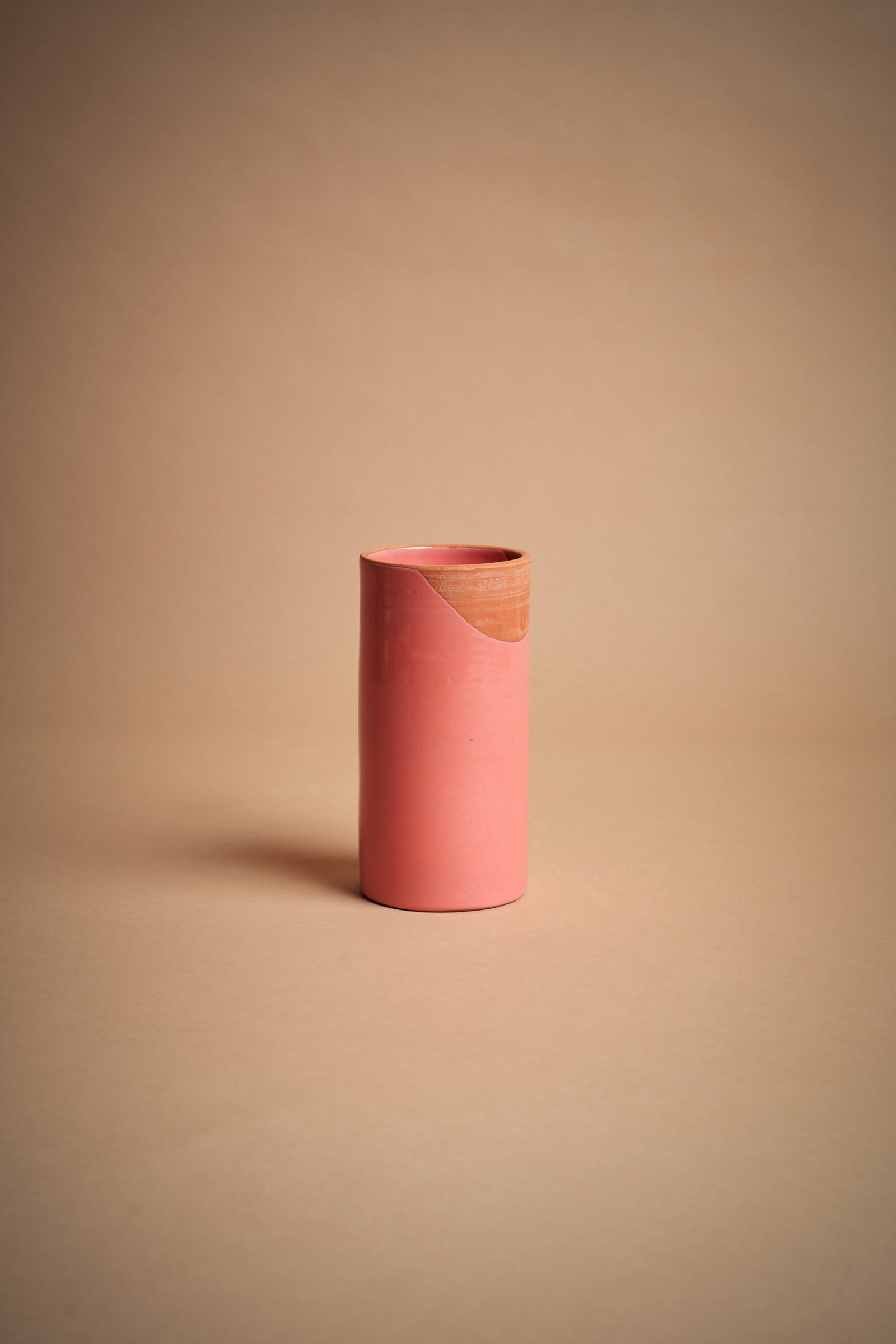 Vaso cilindrico con bocca stretta in ceramica artigianale, con superficie lucida rosa e sezione naturale non smaltata. Perfetto per fiori freschi o secchi, aggiunge un tocco elegante alla tua casa. Modellato a mano, unisce funzionalità e design sofisticato. Un vaso unico, ideale per arredare con stile e autenticità.