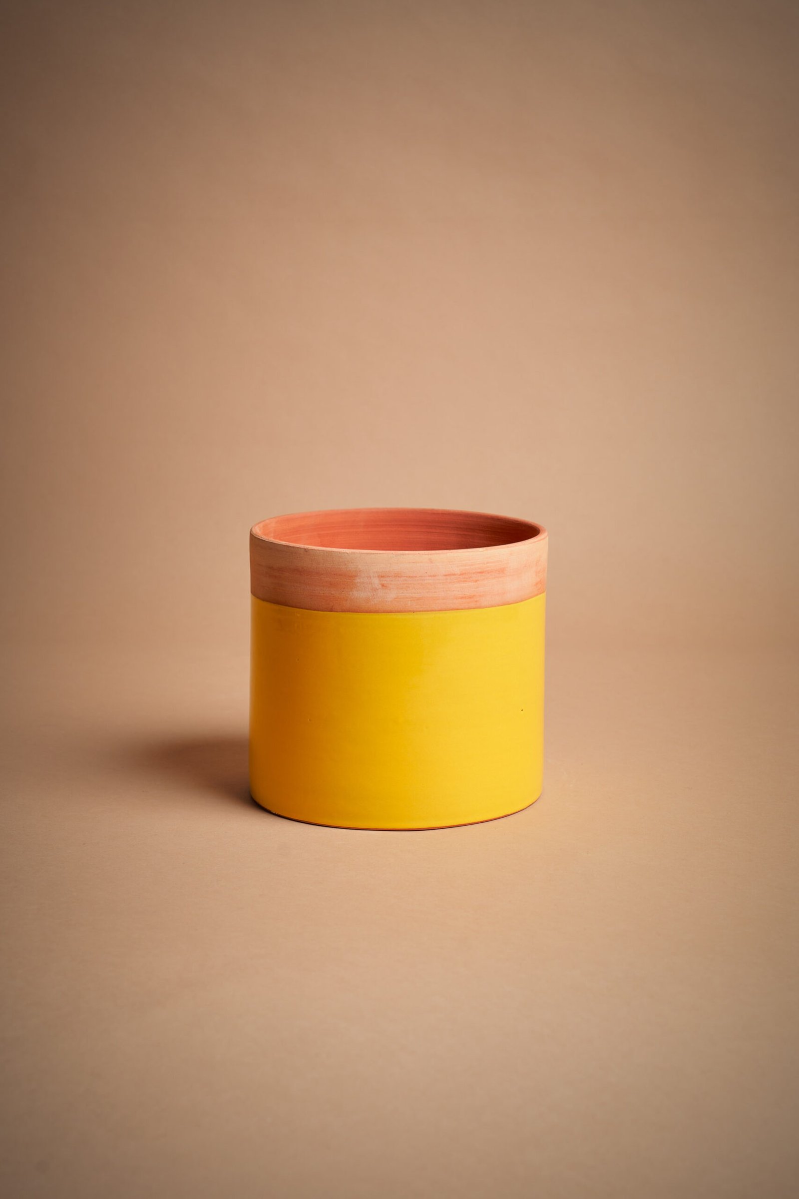 IVA incl.Questo vaso cilindrico con bocca larga in ceramica artigianale, con superficie lucida gialla e sezione naturale non smaltata, è perfetto per piante di grandi dimensioni o composizioni floreali ricche. La sua forma ampia e elegante lo rende un elemento decorativo versatile, ideale per arricchire salotti, ingressi o spazi esterni.