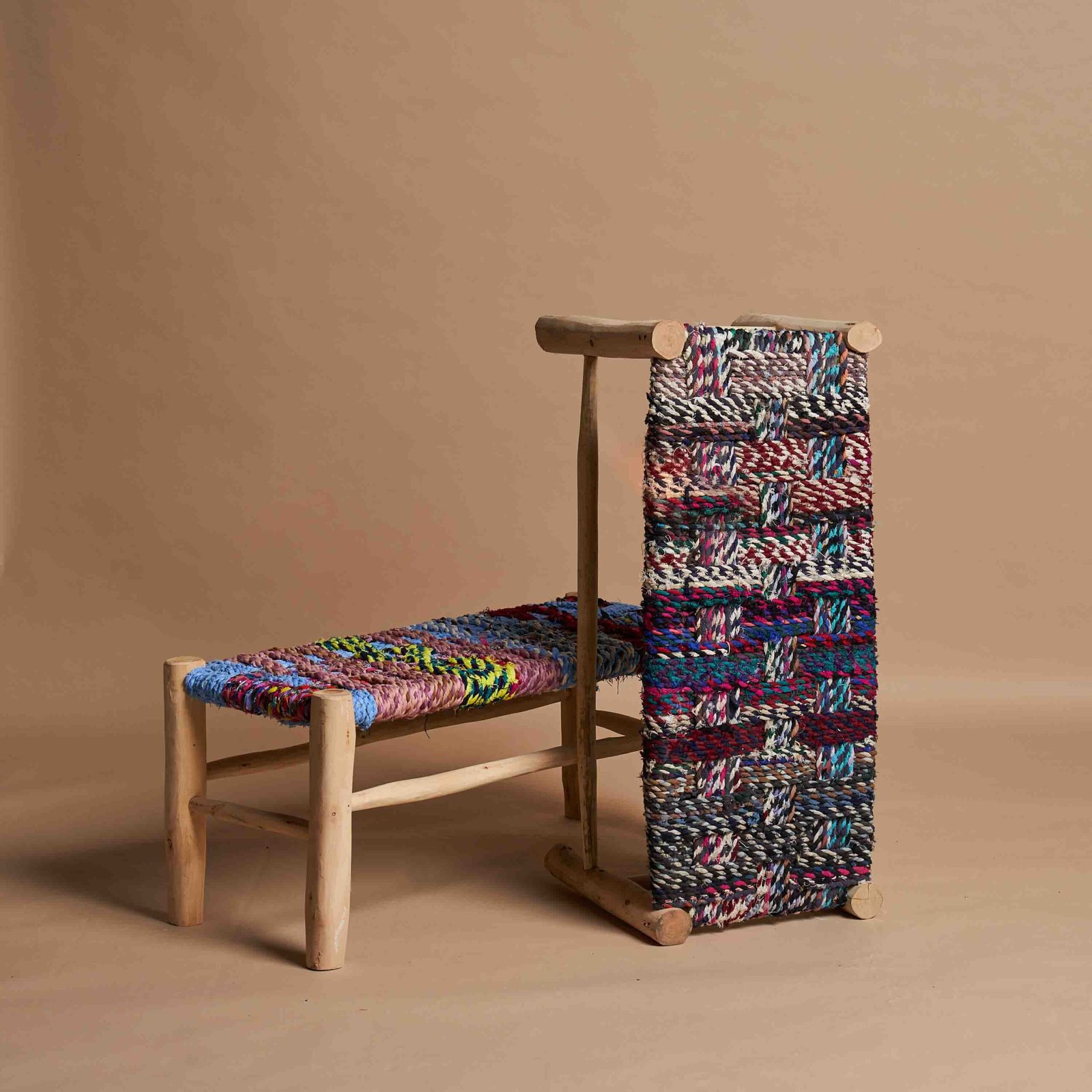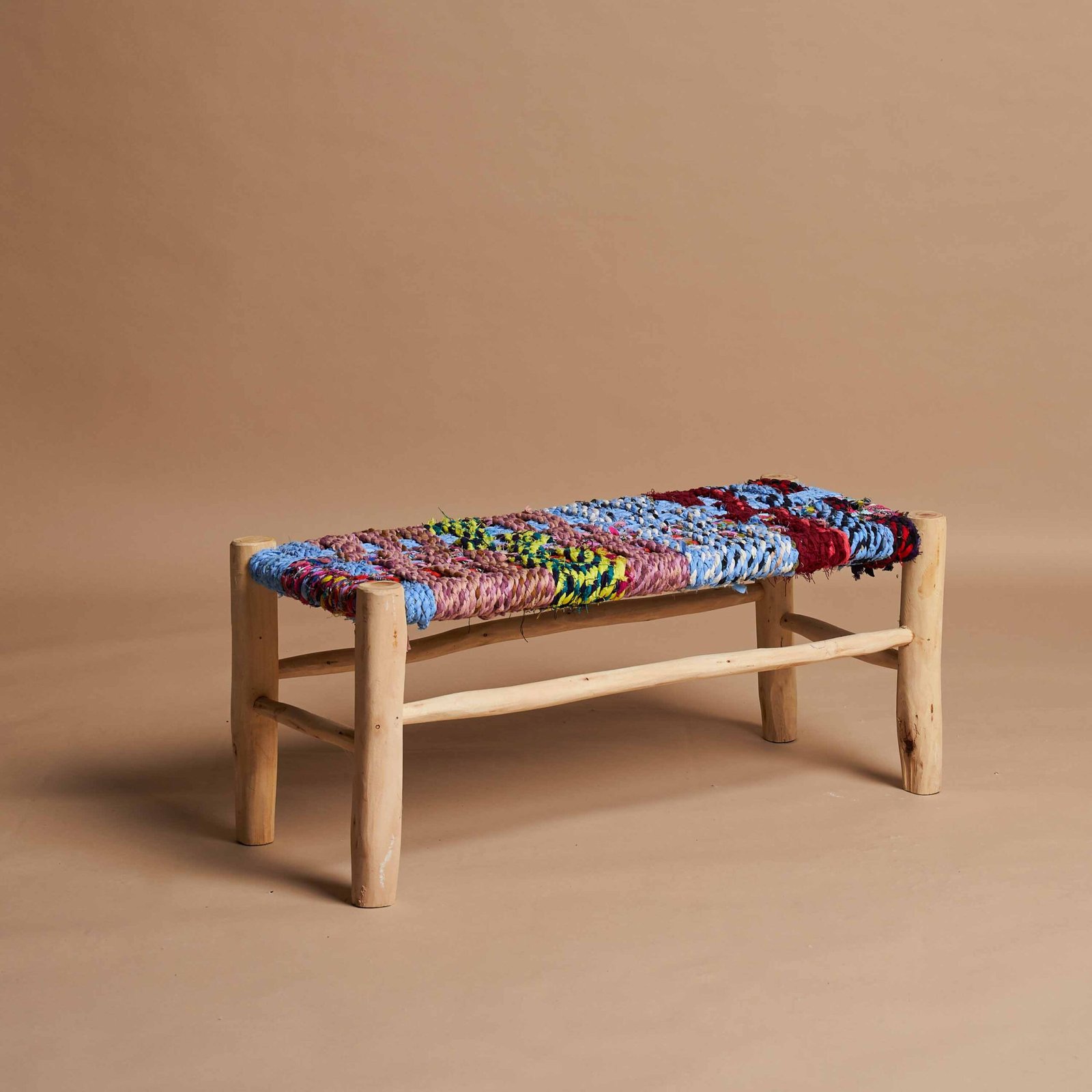 Panca artigianale in legno naturale e tessuto
