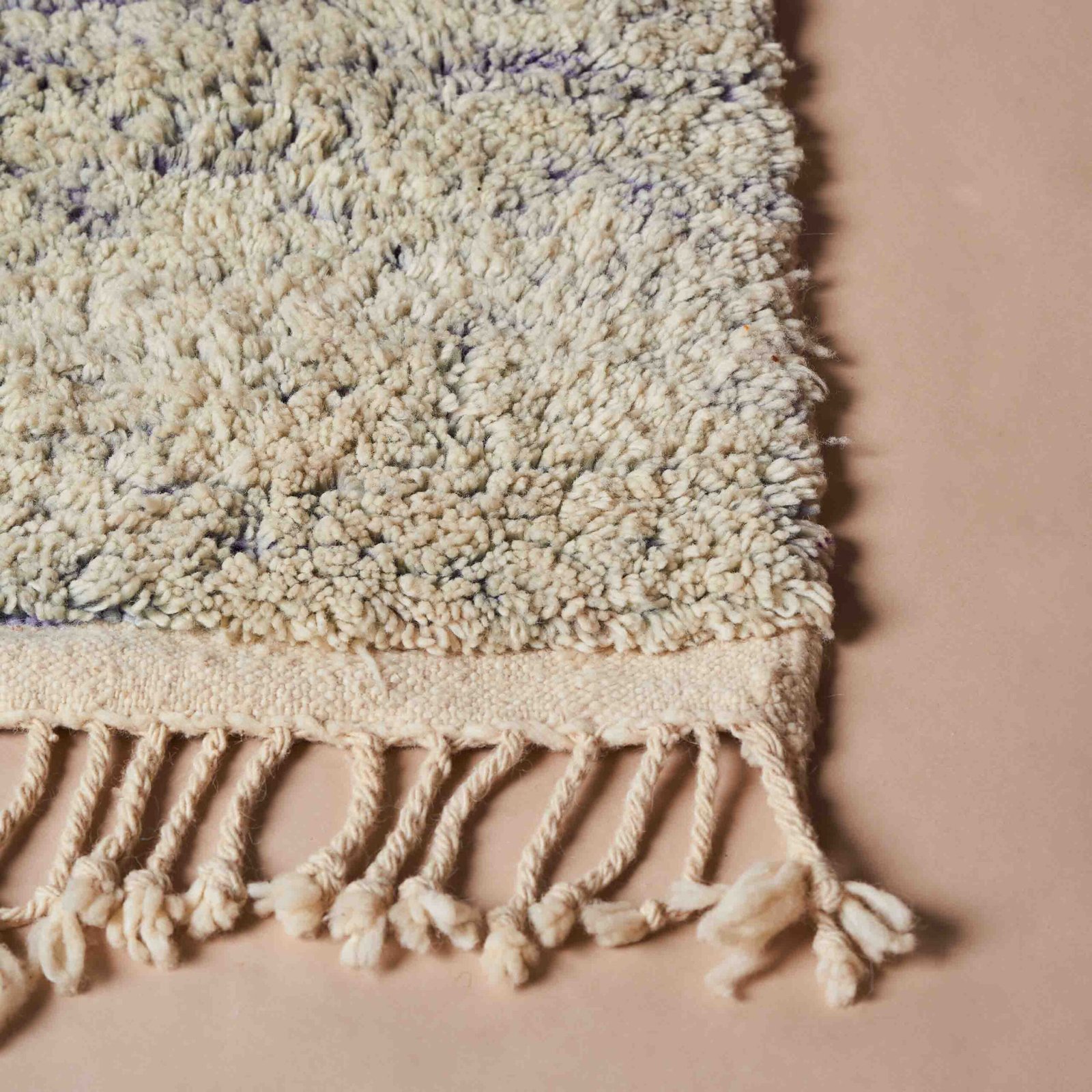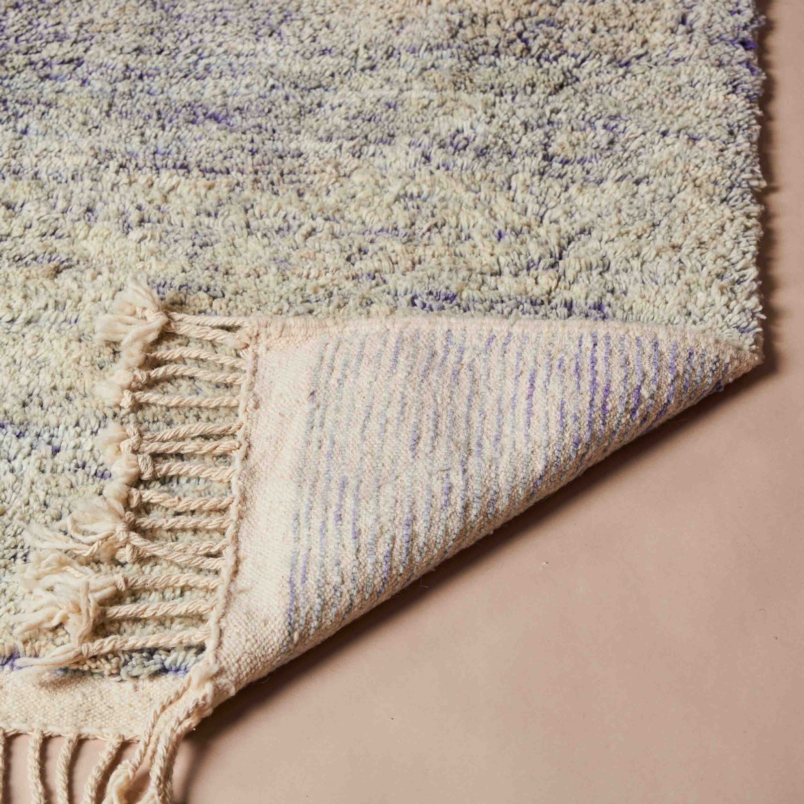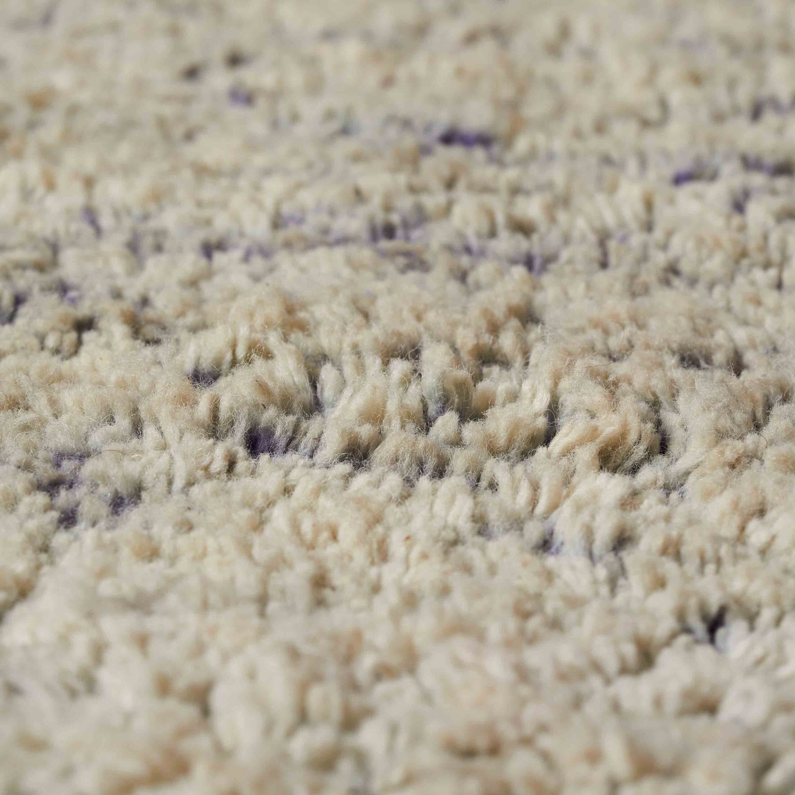 Questo raffinato tappeto Beni Ouarain colpisce per il suo design astratto, impreziosito da sfumature viola che si dissolvono armoniosamente su uno sfondo avorio naturale. Interamente realizzato a mano con pregiata lana naturale, offre una texture soffice e resistente, perfetta per creare un’atmosfera accogliente ed elegante in ogni ambiente. Ideale per arredare spai moderni o classici, rappresenta una fusione autentica tra tradizione artigianale marocchina e versatilità contemporanea. Le sue tonalità sofisticate e la morbidezza al tatto lo rendono un elemento decorativo unico, capace di esaltare il carattere di soggiorni, camere da letto o angoli relax con calore e stile autentico.