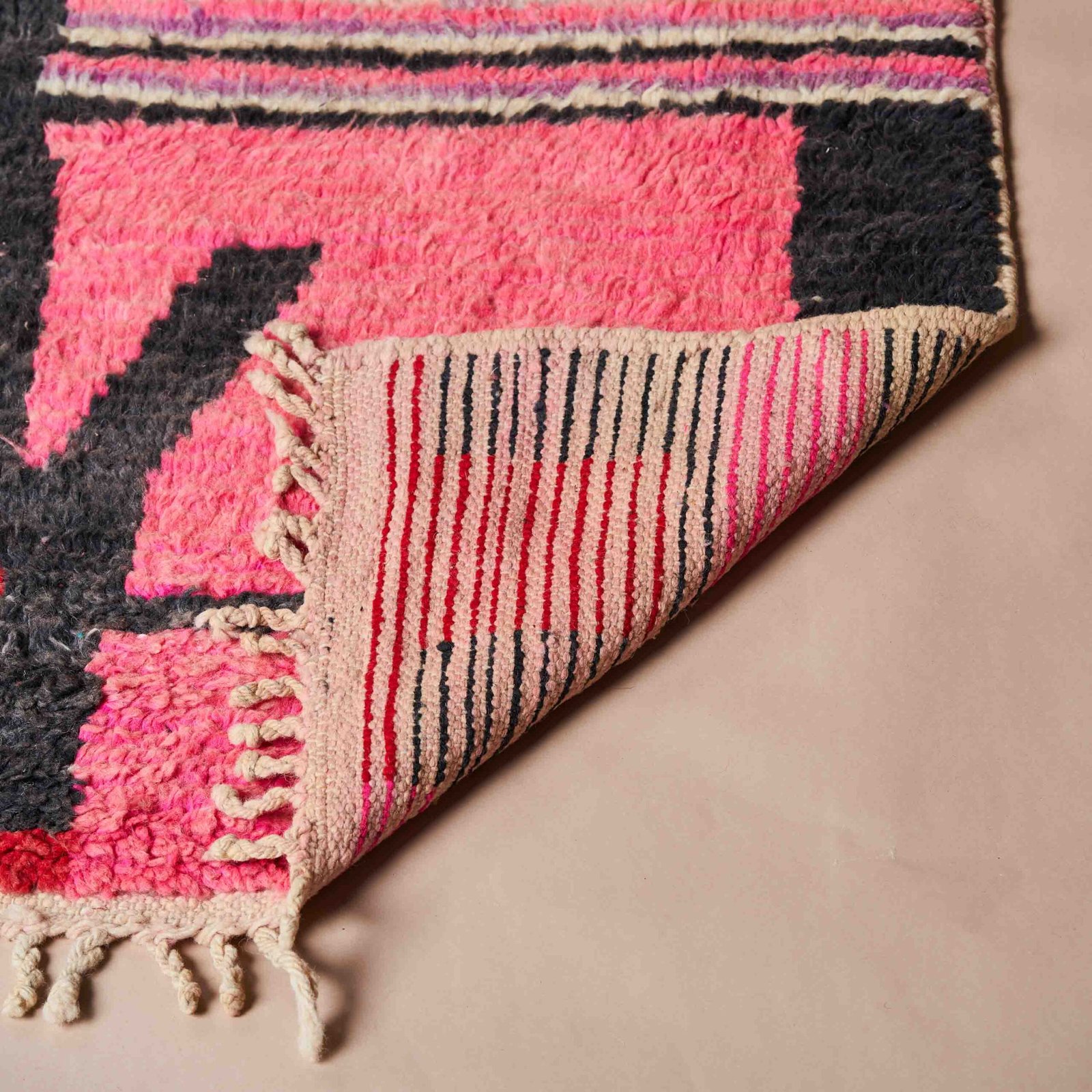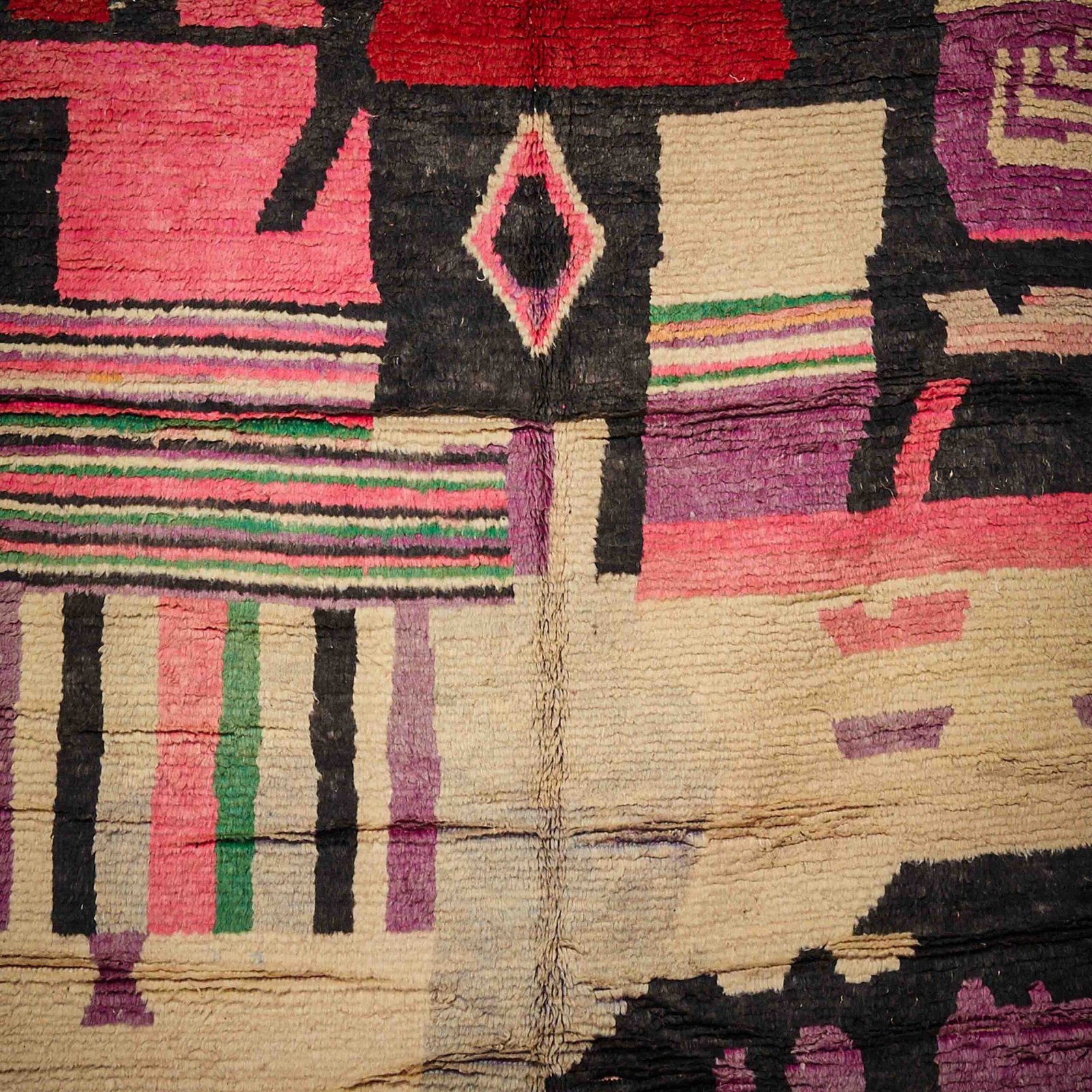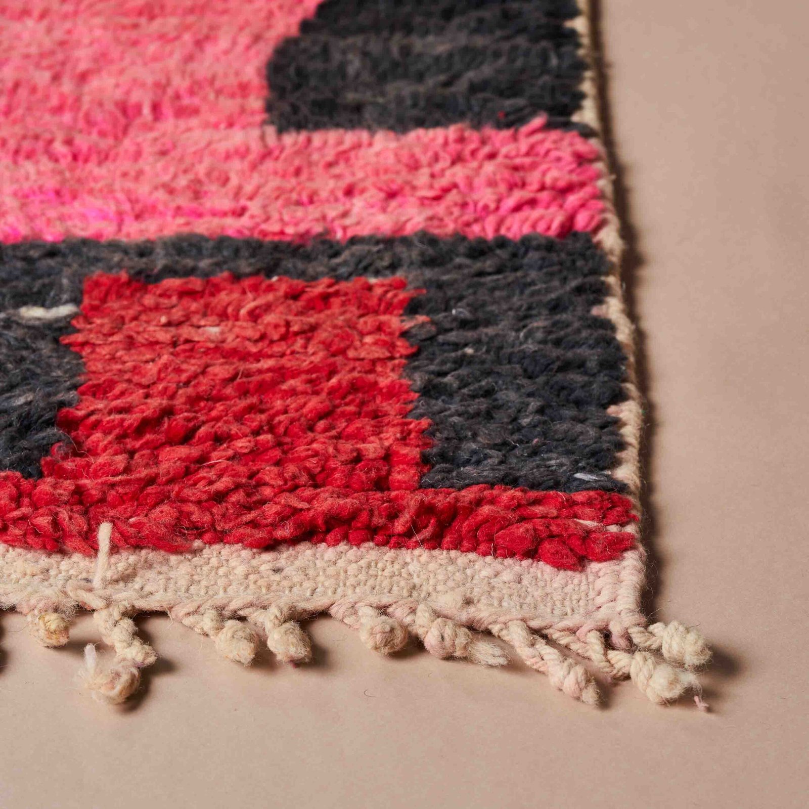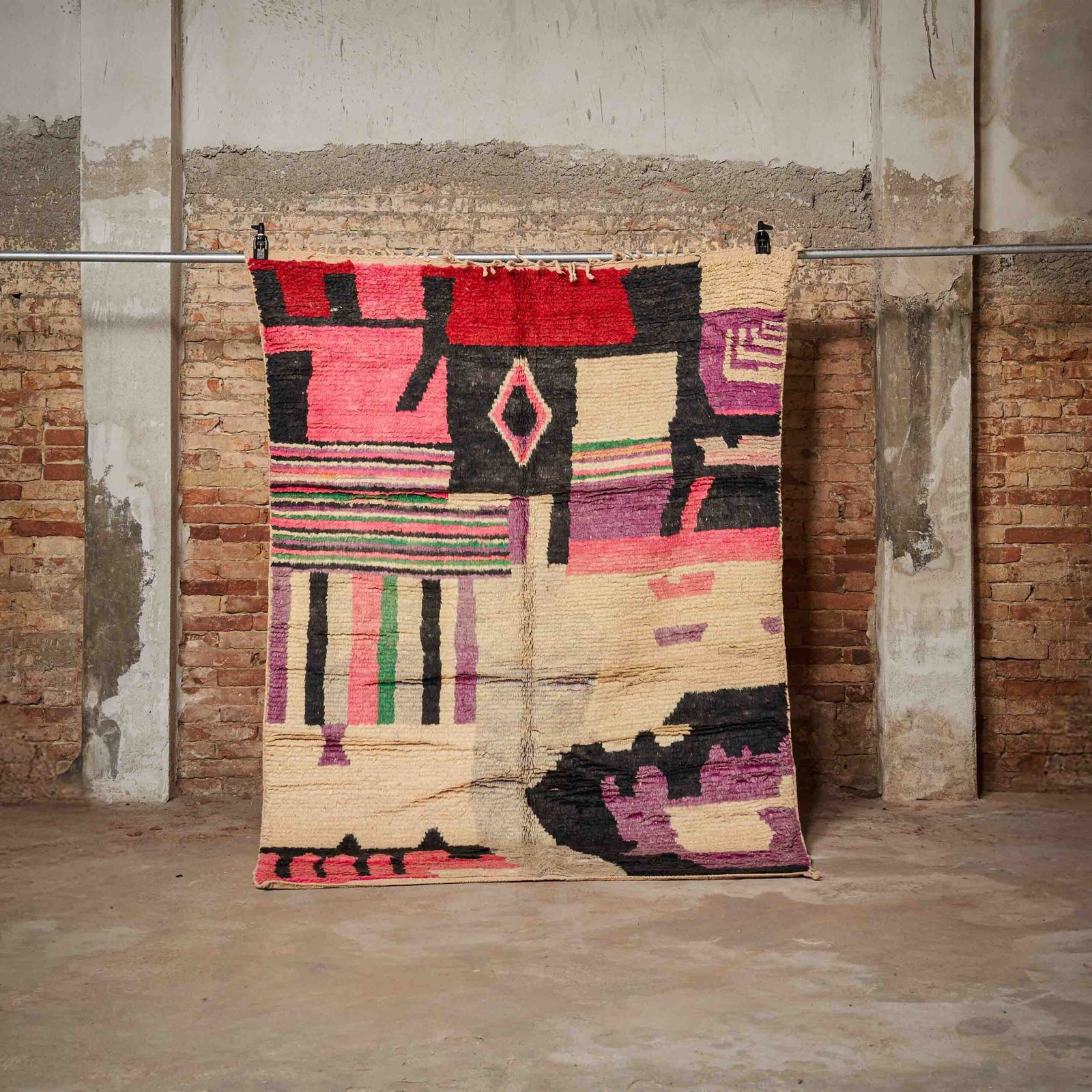 Questo splendido tappeto Boujaad marocchino è un autentico capolavoro artigianale, ideale per dare un tocco unico e sofisticato a qualsiasi ambiente. Caratterizzato da un design audace e vivace, unisce tradizione e modernità attraverso una combinazione dinamica di colori intensi, tra cui rosso, nero, rosa e viola. I motivi geometrici irregolari, tipici dell’arte tessile berbera, donano personalità e profondità visiva. Interamente realizzato a mano con lana pregiata, questo tappeto non è solo esteticamente affascinante, ma anche resistente e piacevole al tatto. Perfetto per arricchire salotti, camere da letto o studi, aggiungendo calore, autenticità e un inconfondibile charme marocchino.
