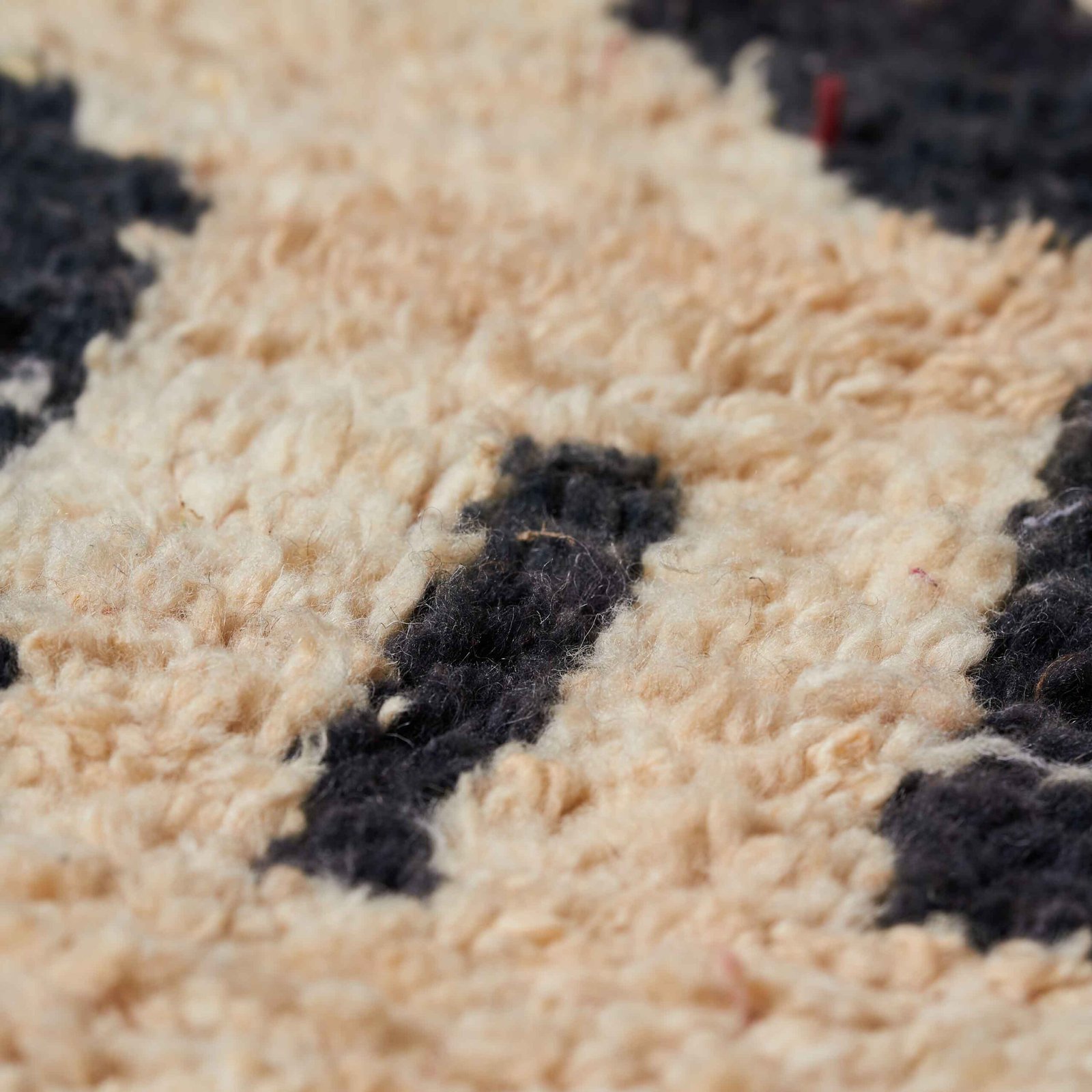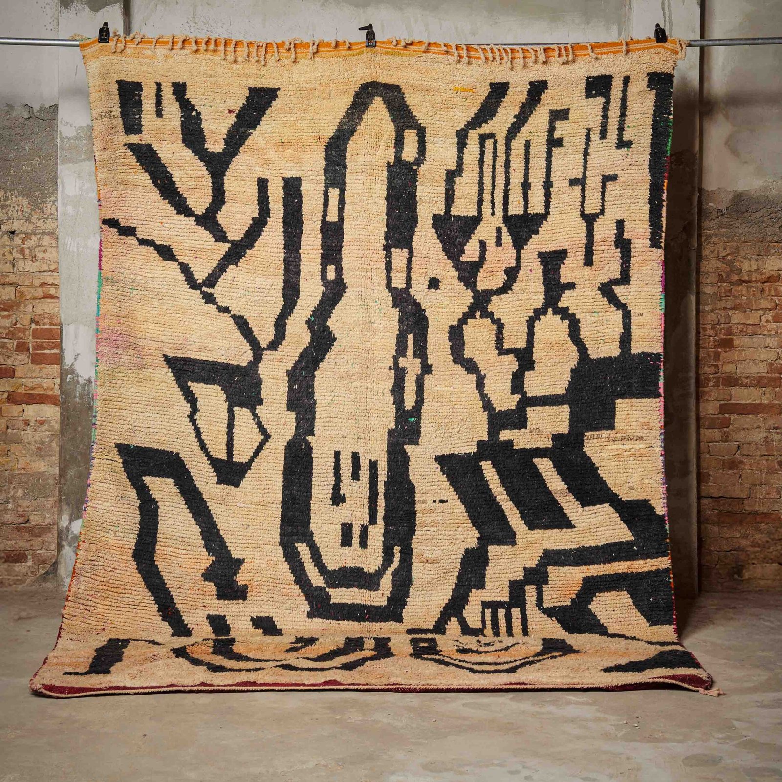 Questo tappeto Boujaad marocchino è un meraviglioso esemplare di design minimalista combinato con l’arte tessile tradizionale delle regioni berbere del Marocco. Le sue tonalità neutre, che spaziano tra il beige caldo e il crema naturale, si fondono armoniosamente con audaci motivi astratti in nero intenso. I disegni geometrici e le forme stilizzate creano un forte impatto visivo, conferendo al tappeto un fascino senza tempo. Questo pezzo unico è perfetto per arricchire sia spazi contemporanei che ambienti dal carattere rustico, aggiungendo stile, autenticità e un tocco di storia artigianale. Una scelta ideale per chi cerca qualità e tradizione tessile marocchina.