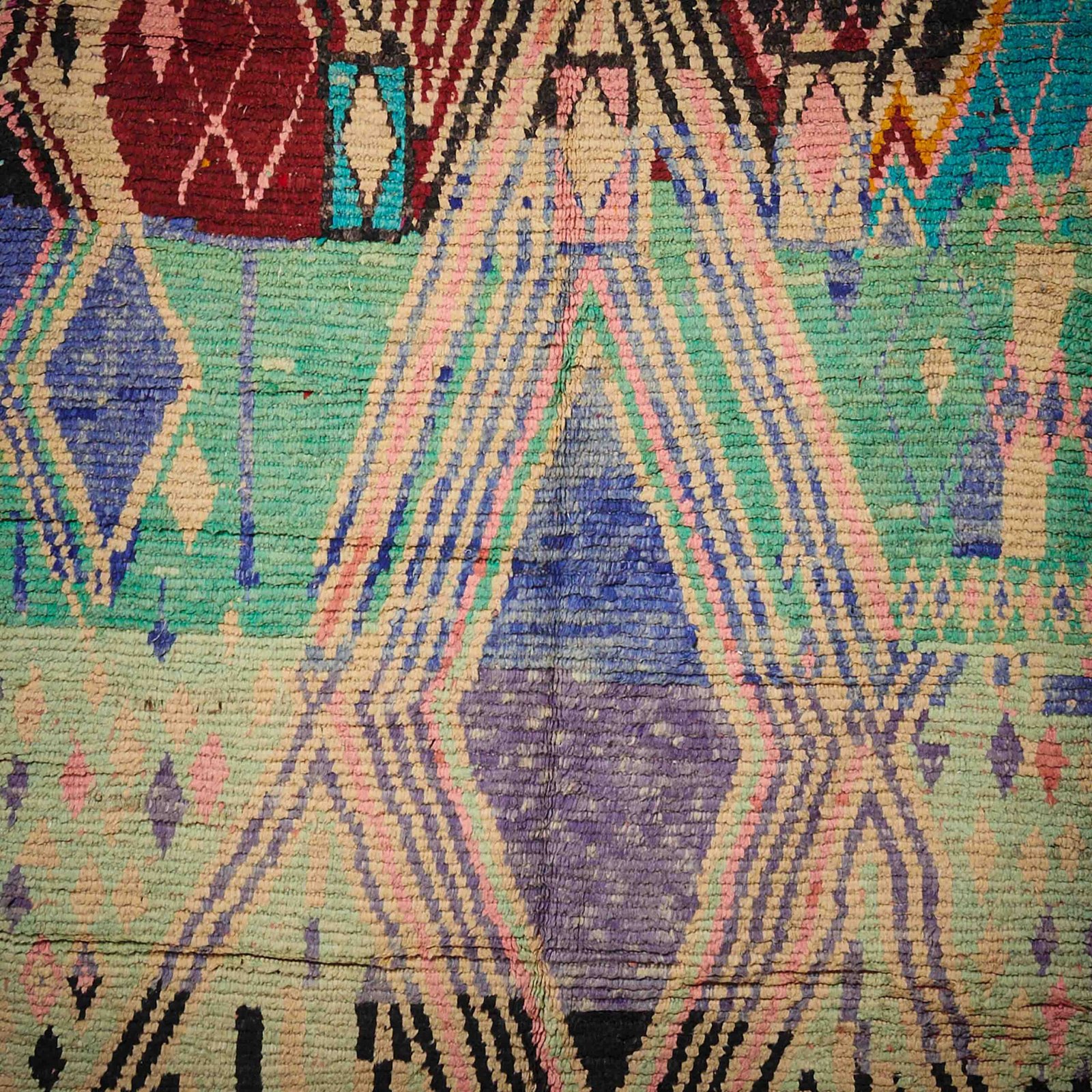 Questo affascinante tappeto Boujaad marocchino è caratterizzato da motivi geometrici distintivi e colori delicati, come verde, viola e rosso. Realizzato a mano con lana naturale di alta qualità, unisce tradizione e creatività in un design unico. Ideale per aggiungere un tocco boho-chic agli interni, donando calore e personalità agli ambienti.