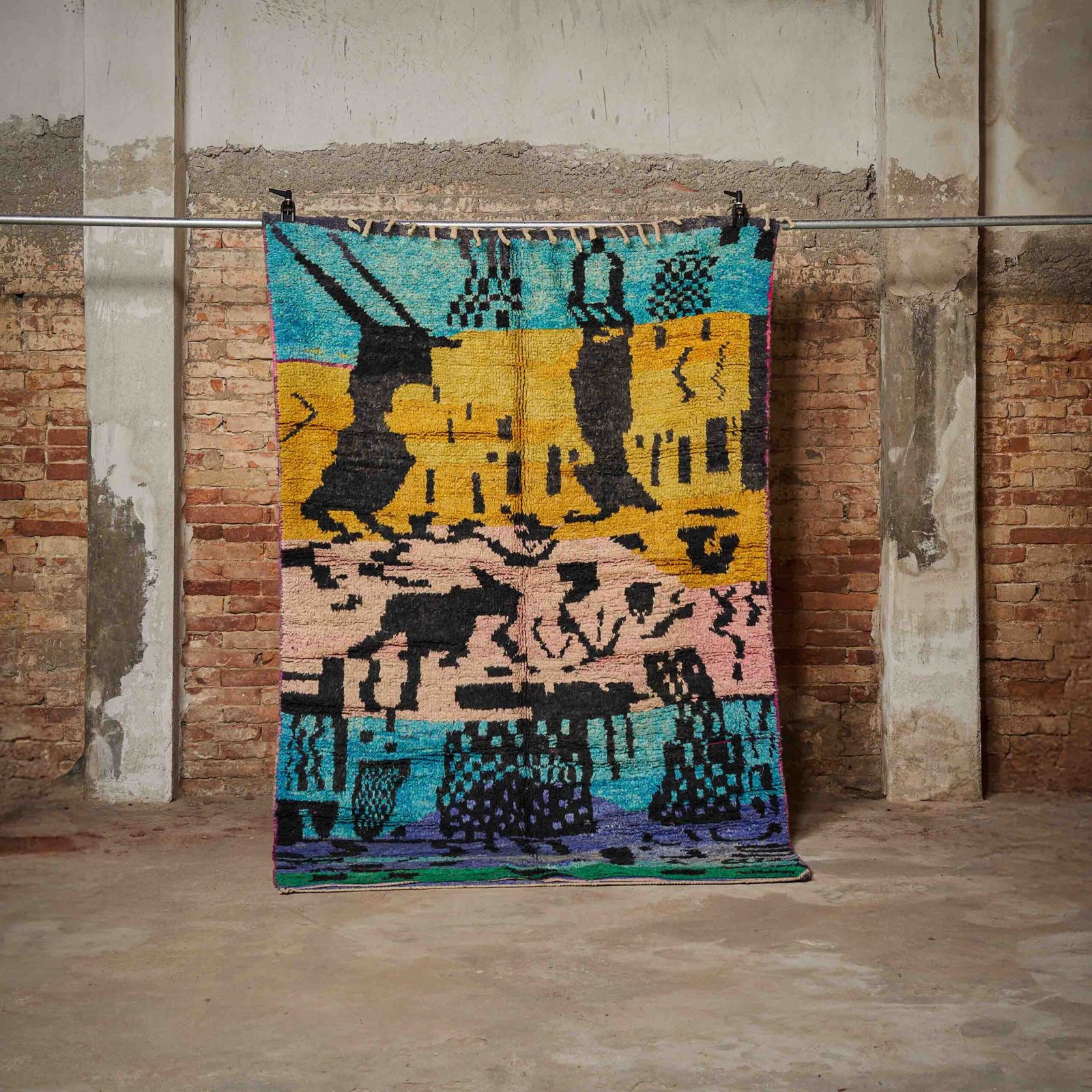 Questo straordinario tappeto Boujaad marocchino è una vera opera d’arte tessile, caratterizzato da una vibrante combinazione di colori che spaziano dal turchese intenso al giallo solare, dal nero elegante al delicato rosa pastello. Realizzato a mano con lana di alta qualità, offre una texture morbida e resistente, ideale per l’uso quotidiano. I motivi astratti e creativi richiamano la tradizione berbera, donando al tappeto un fascino autentico e senza tempo. Perfetto per chi desidera trasformare il proprio ambiente domestico con un tocco artistico e culturale, questo tappeto rappresenta una scelta ideale per spazi moderni o dallo stile etnico.