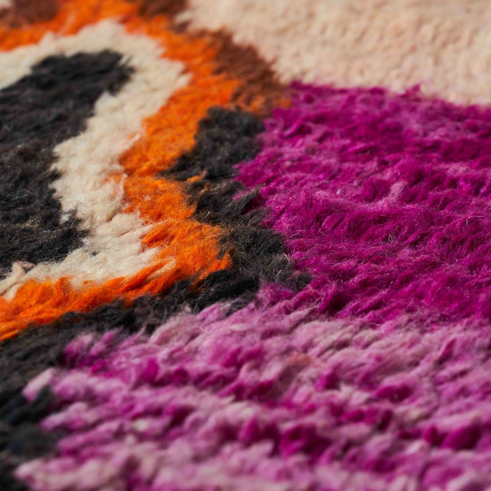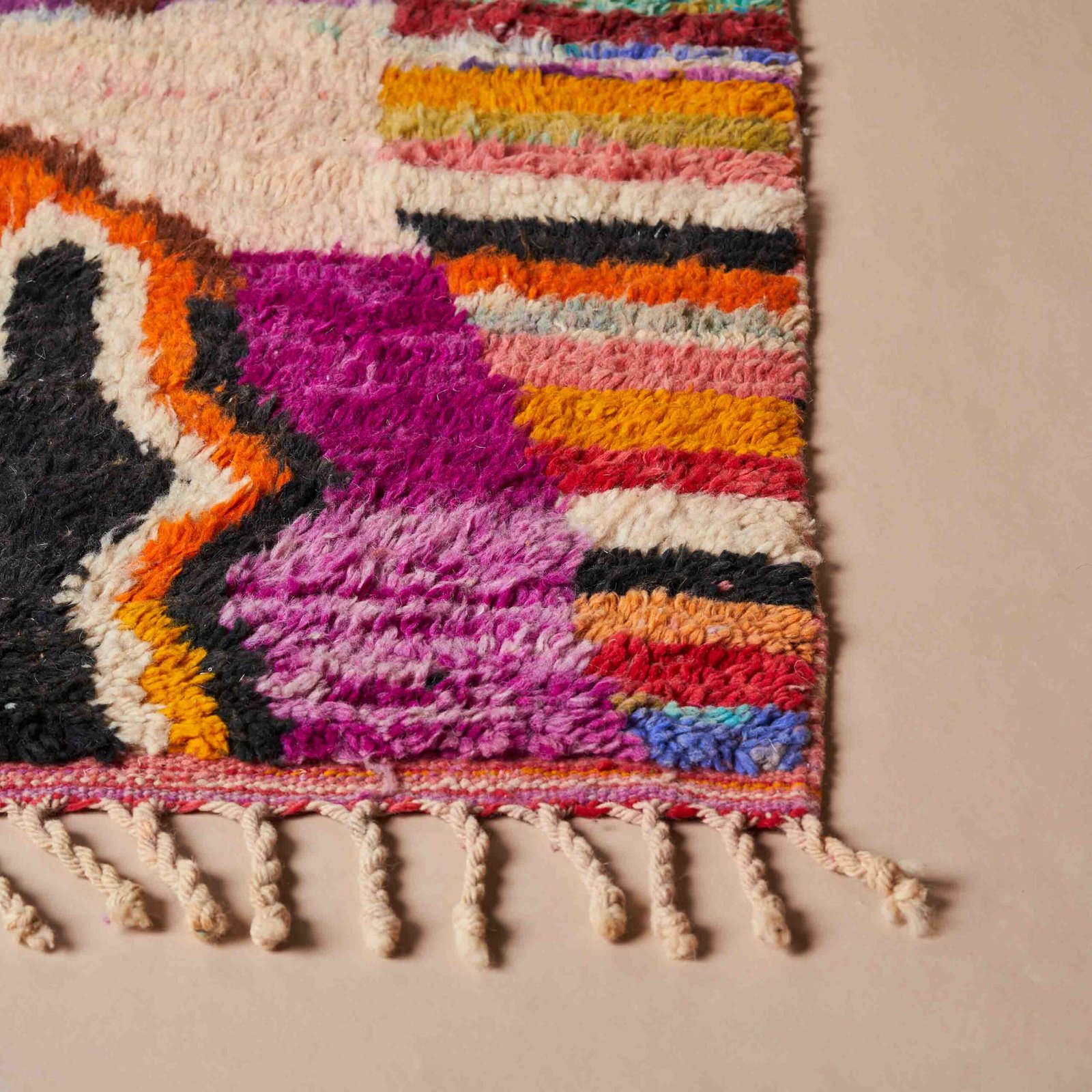 Questo vibrante tappeto Boujaad marocchino è un’autentica opera d’arte tessile, caratterizzata da un’esplosione di colori accesi come rosa, arancio, viola e turchese. I motivi geometrici intricati si intrecciano con simboli berberi tradizionali, creando un design unico e affascinante. Realizzato a mano con lana pregiata dalle abili artigiane del Marocco, questo tappeto rappresenta una fusione perfetta tra tradizione e creatività. La sua texture morbida e i dettagli accurati lo rendono ideale per arricchire e personalizzare qualsiasi ambiente domestico, dal soggiorno alla camera da letto. Perfetto per chi cerca eleganza e autenticità, è un elemento decorativo di grande impatto visivo.