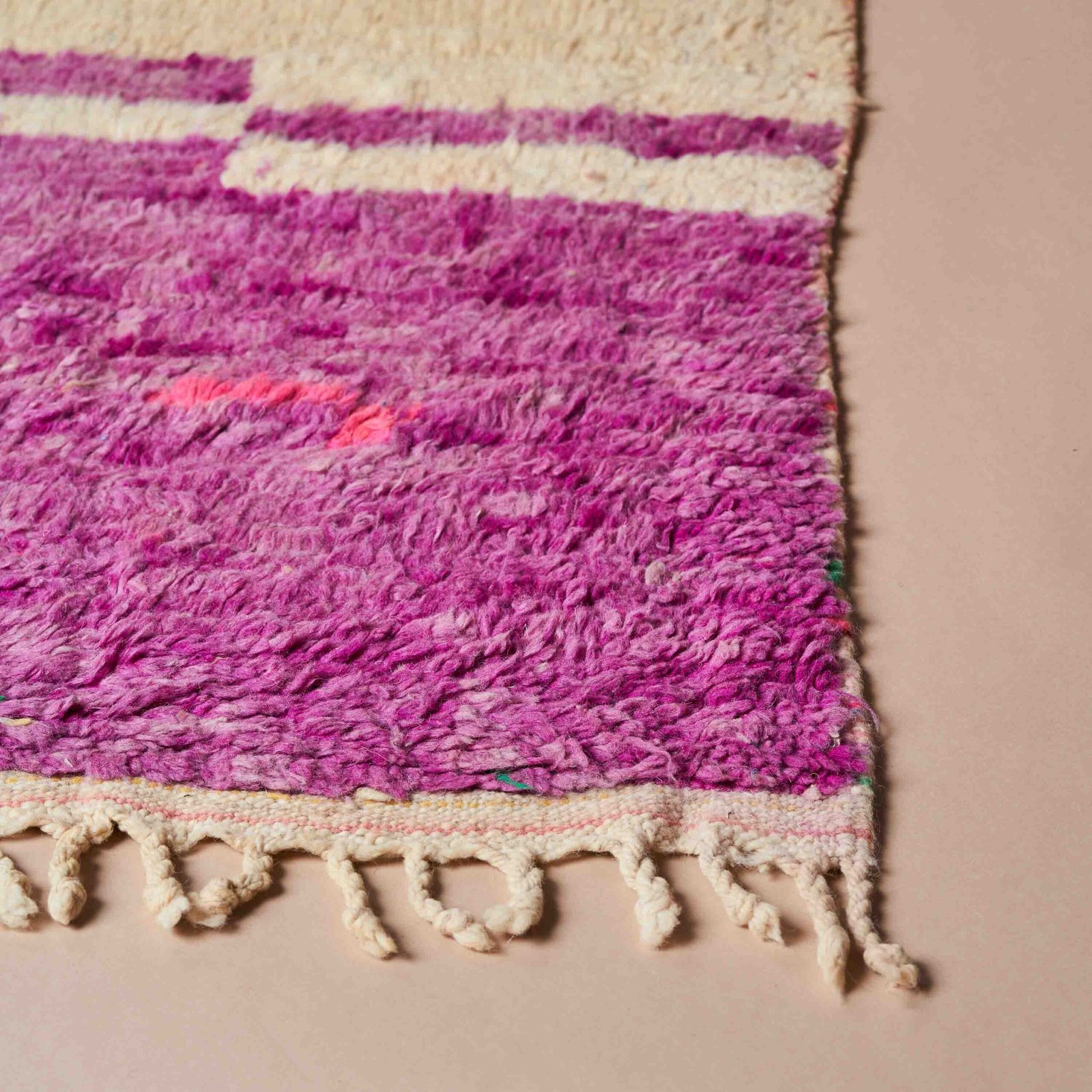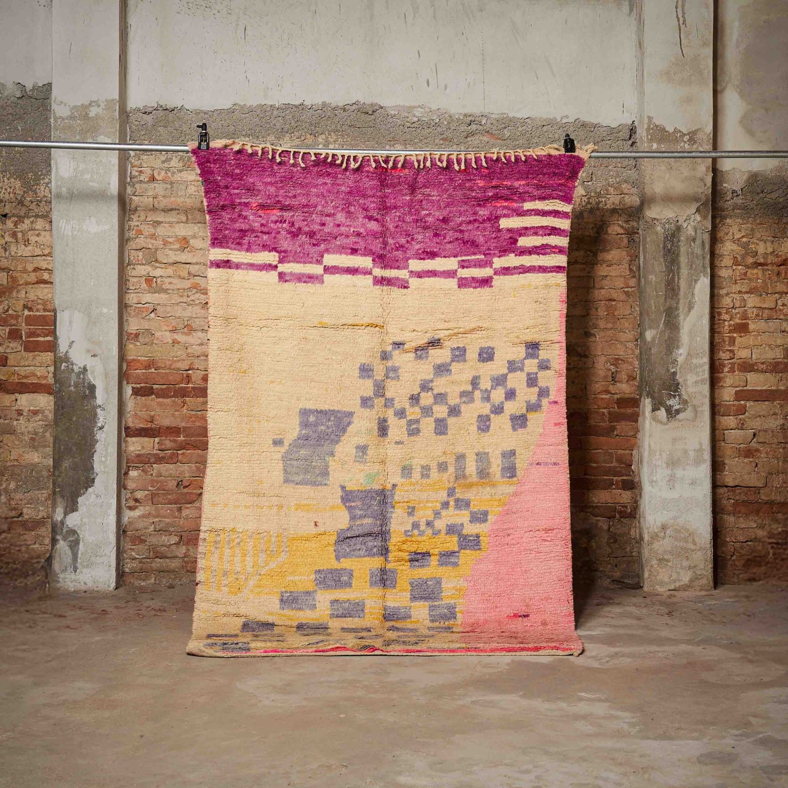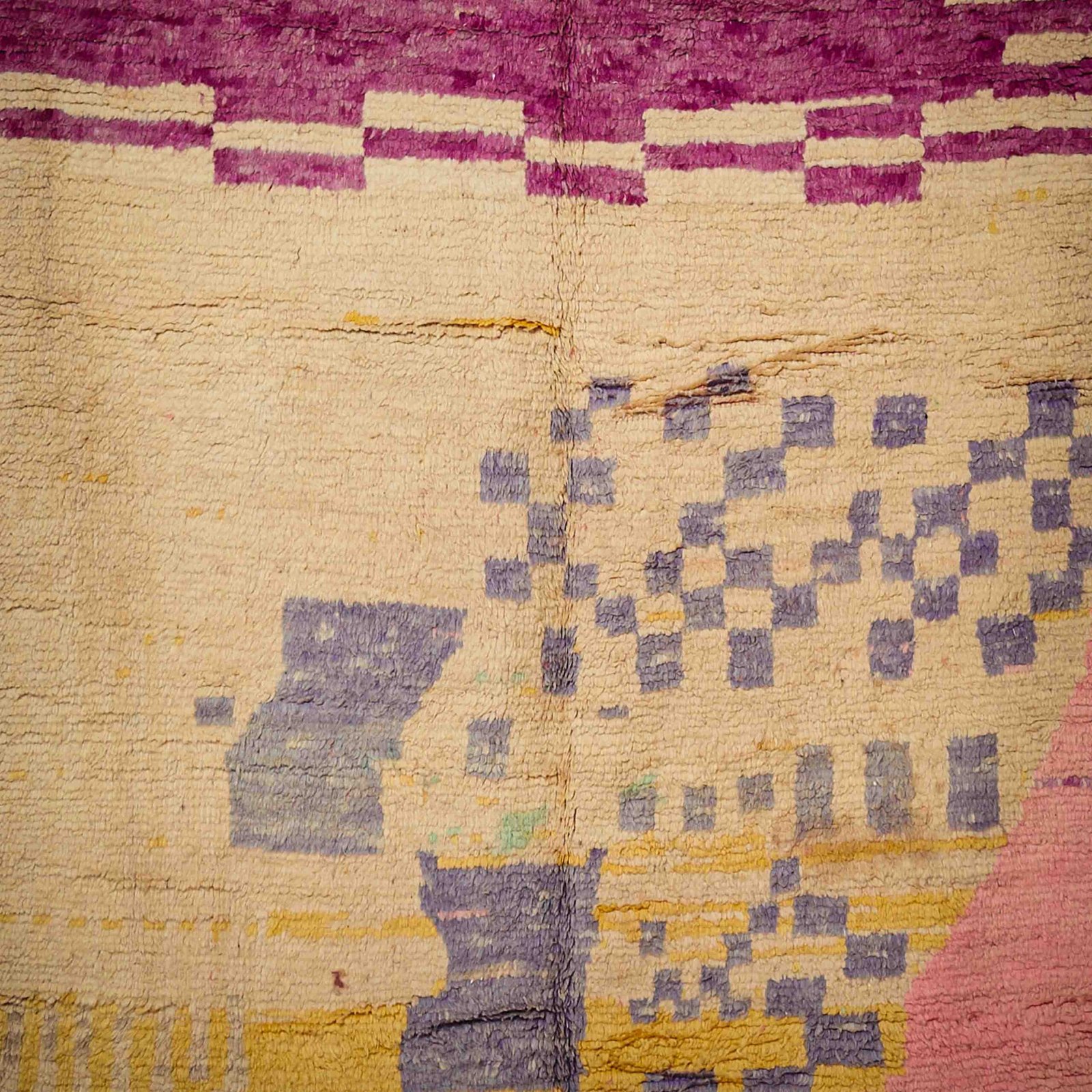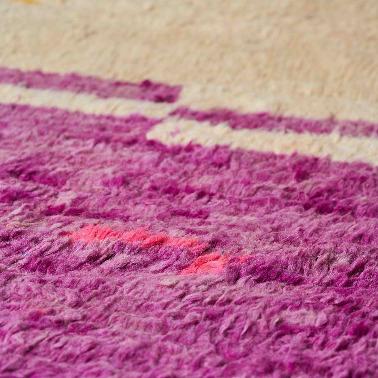 Questo tappeto Boujaad marocchino combina tonalità calde di giallo e rosa con dettagli viola e fucsia vivaci. Realizzato a mano con lana pregiata, presenta un design geometrico astratto che dona dinamismo e carattere. Perfetto per valorizzare spazi moderni o tradizionali, aggiunge un tocco unico e artigianale a qualsiasi ambiente abitativo.